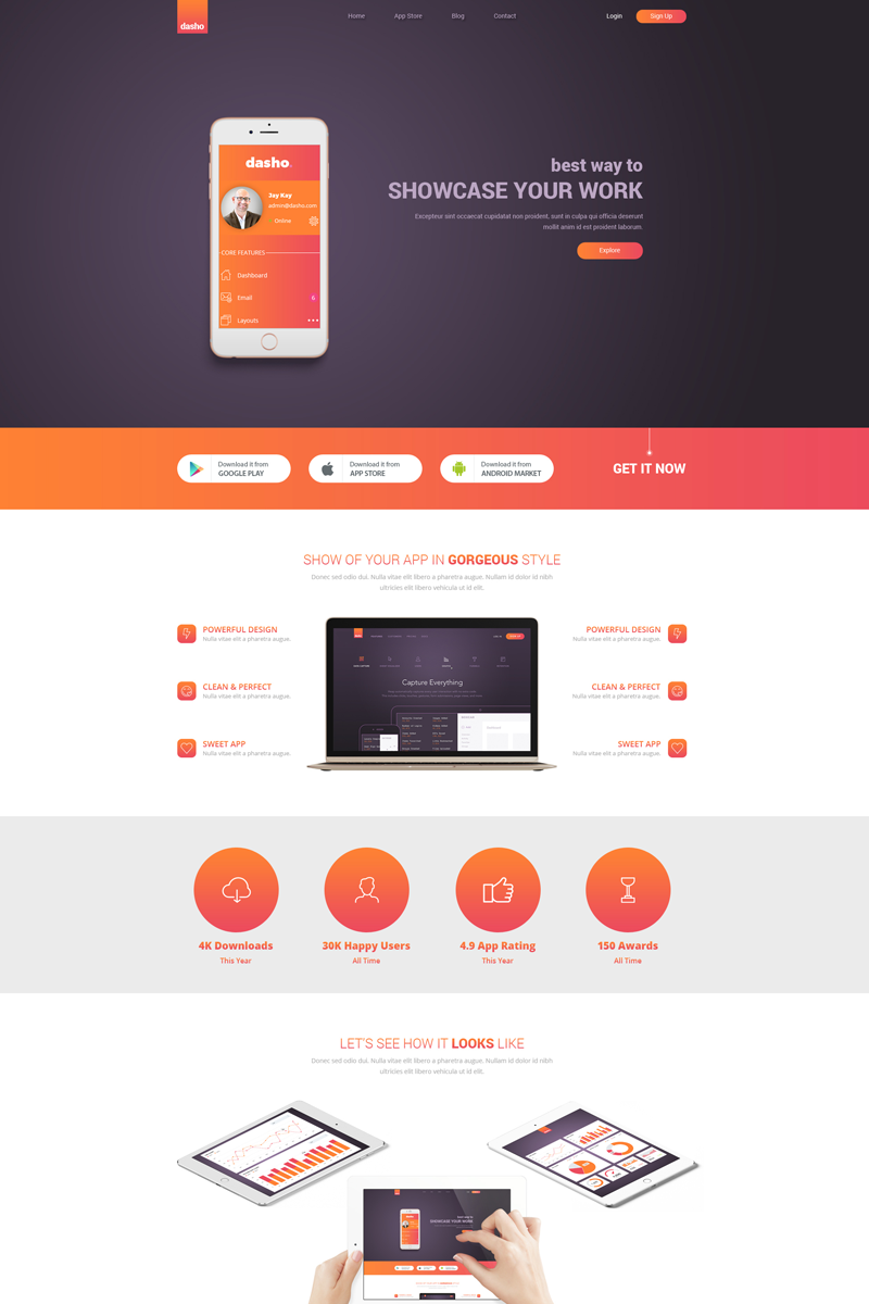 Download PSD шаблон "Dasho - App Showcase & App Store PSD Template" / Dasho - App Showcase & App Store PSD Template - PSD шаблон на тему бизнес услуги app store landing template marketing showcase business shopping unique clean modern responsive market photoshop well-organized layers