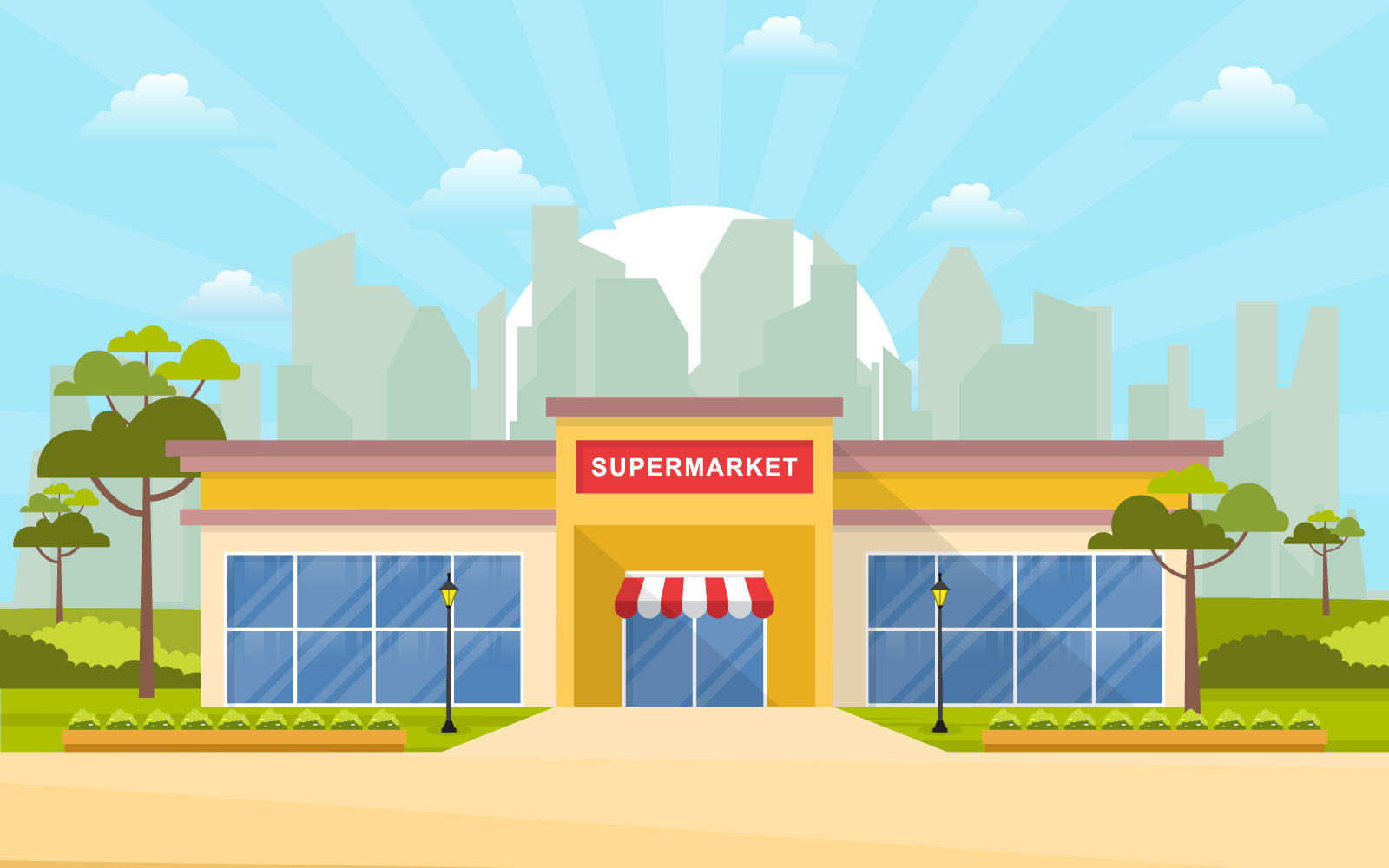 Download Иллюстрация "Design Grocery Exterior - Illustration" / Design Grocery Exterior - Illustration - Иллюстрация на тему графика supermarket,grocery,store,retail,shop,mall,city,building,flat,illustration,vector,template,background,day,clouds,cityscape,tree,car,front,design