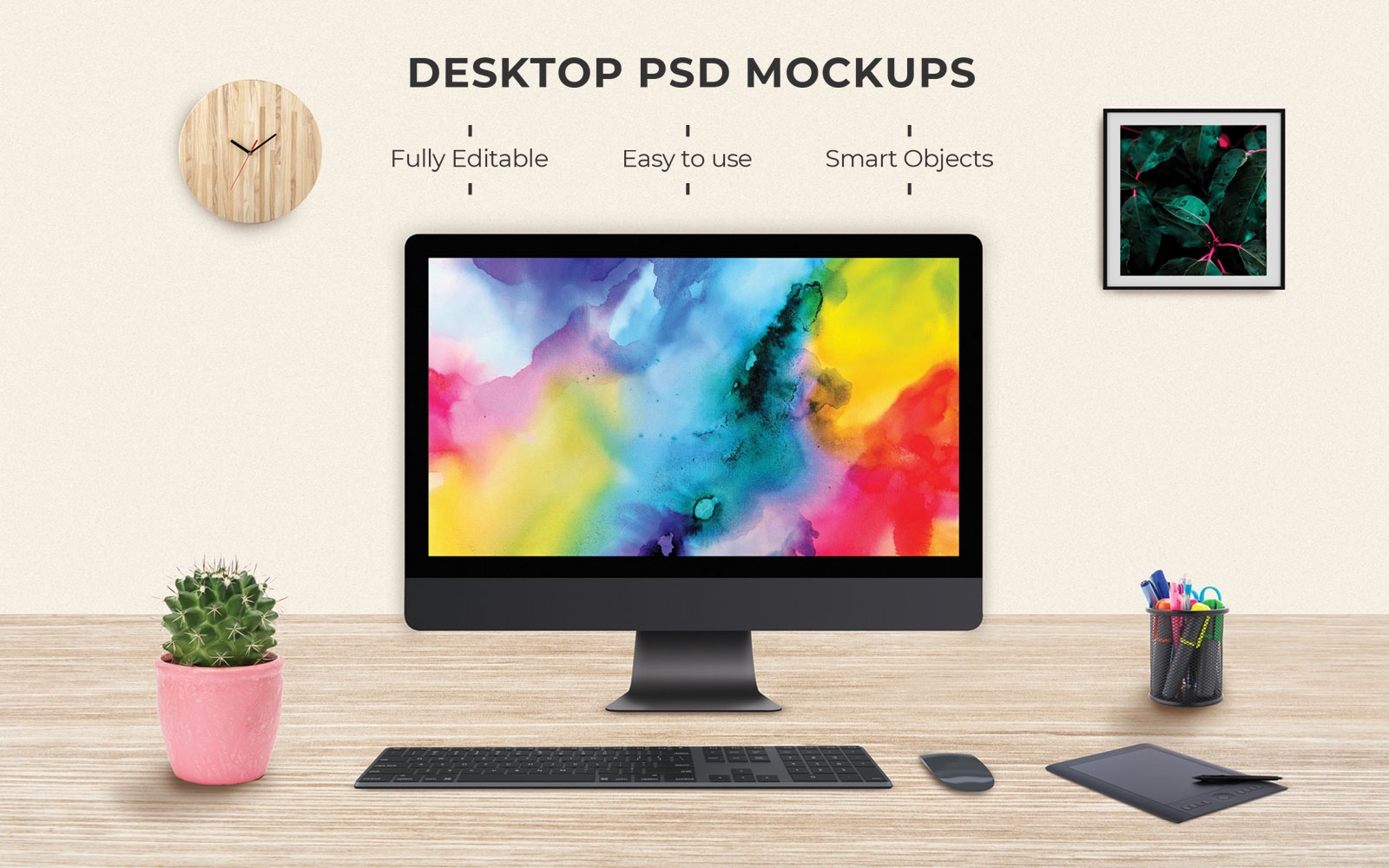 Download Мокап для продукта "Desktop product mockup" / Desktop product mockup - Мокап для продукта на тему графика desktop,mockups,template,imac,pro,mockup,templates,photo,frame,clock,with,table,pot,pen,holder,tablet