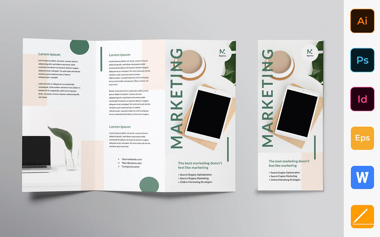 Download Фирменный стиль "Digital Marketing Company Brochure Trifold - Corporate Identity Template" / Digital Marketing Company Brochure Trifold - Corporate Identity Template - Фирменный стиль на тему графика brochure,trifold,template,corporate,company,branding,marketing,agency,strategy,management,customer,promotion,white,green,pastel