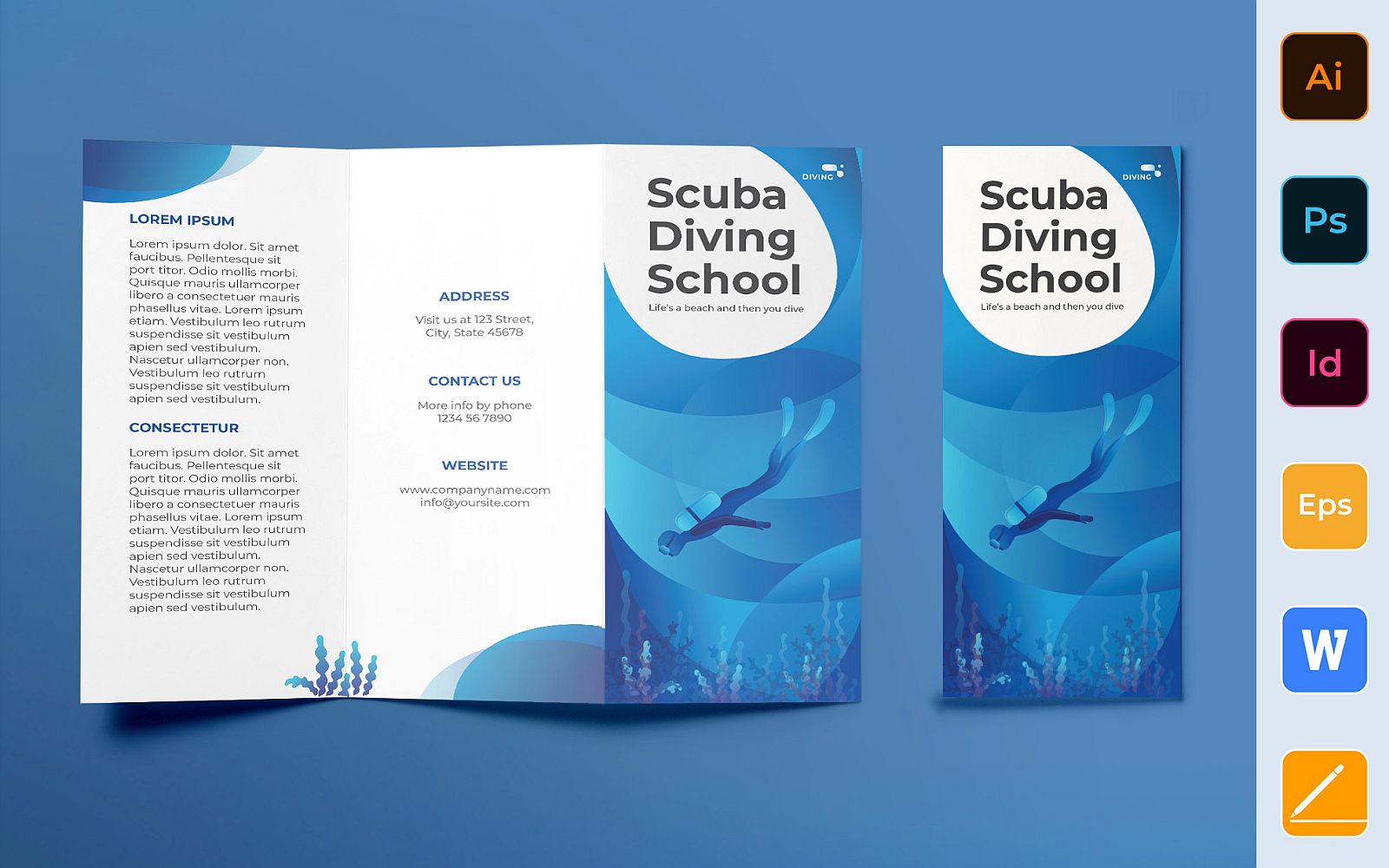Download Фирменный стиль "Diving School Brochure Trifold - Corporate Identity Template" / Diving School Brochure Trifold - Corporate Identity Template - Фирменный стиль на тему графика brochure,trifold,template,corporate,company,branding,diving,diver,scuba,extreme,courses,underwater,white,blue,marine