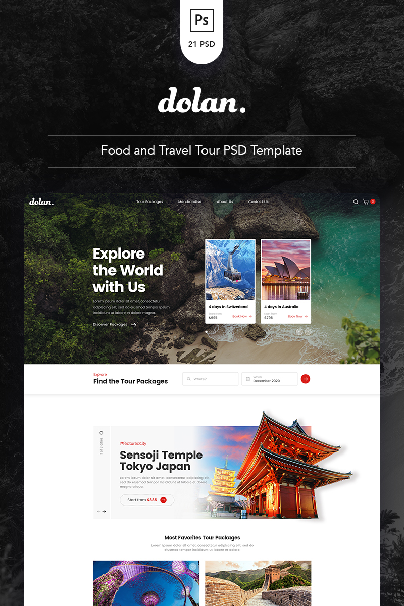 Download PSD шаблон "Dolan - Food and Travel Tour PSD Template" / Dolan - Food and Travel Tour PSD Template - PSD шаблон на тему еда и ресторан blog city e-commerce food holiday itinerary psd template review store tour travel traveling