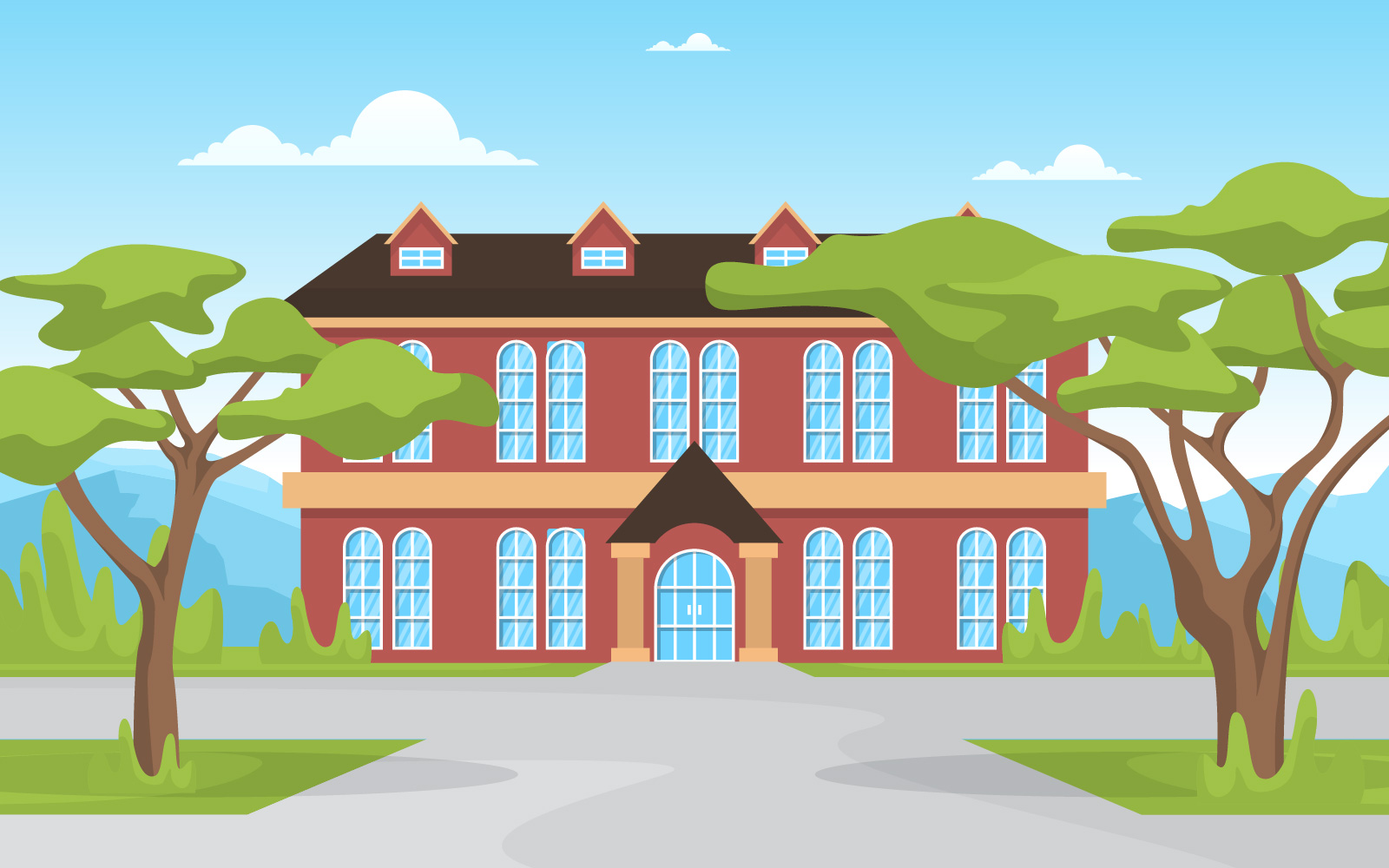 Download Иллюстрация "Education Building Landscape - Illustration" / Education Building Landscape - Illustration - Иллюстрация на тему графика school,education,building,park,outdoor,landscape,cartoon,illustration,vector,high,exterior,flat,entrance,front,study,art,city,grass,view,library
