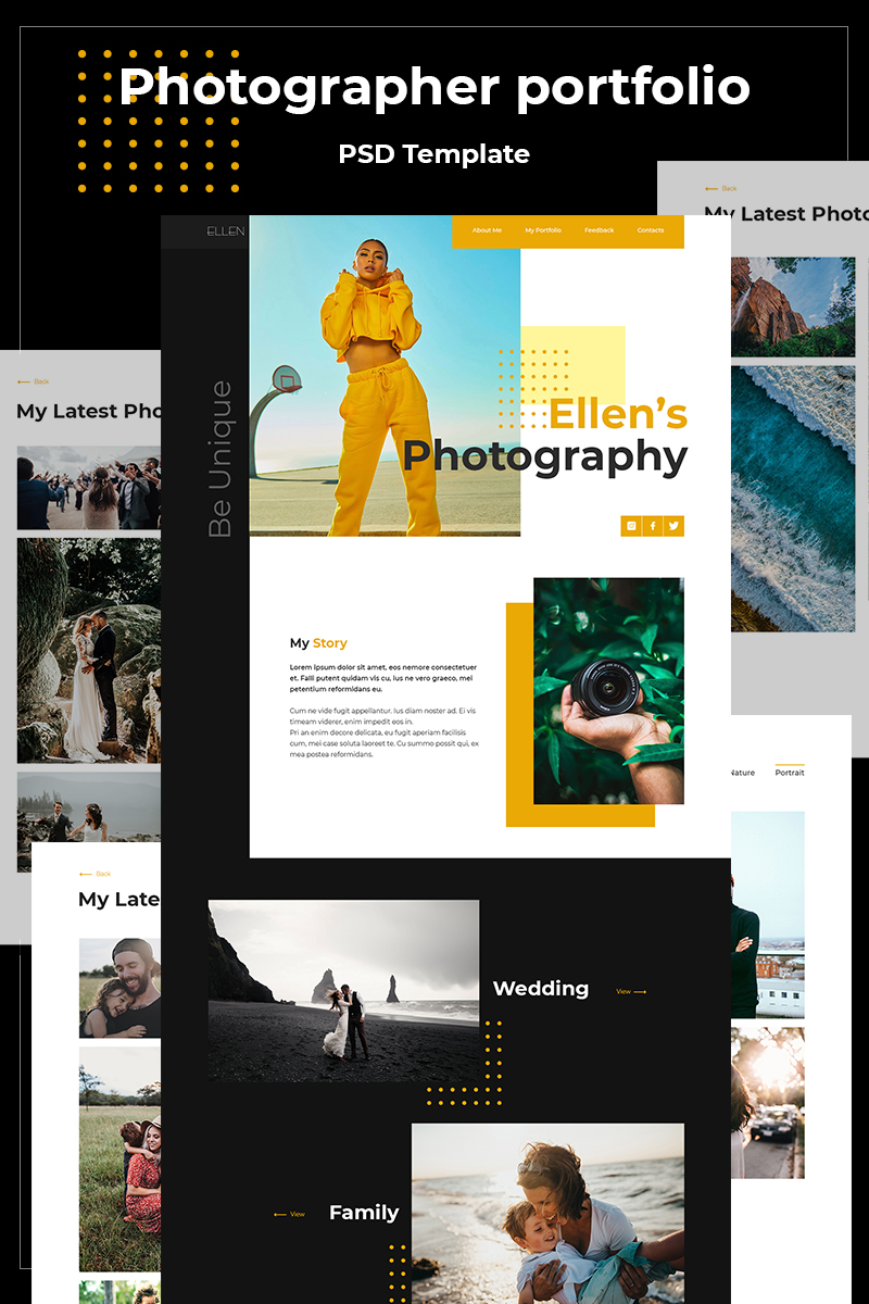 Download PSD шаблон "Ellen's Photography PSD Template" / Ellen's Photography PSD Template - Адаптивный PSD шаблон на тему портфолио фотографа psd responsive photography photogallery weddingphotography portrait photoshoot naturephotos photo portfoliowebsite