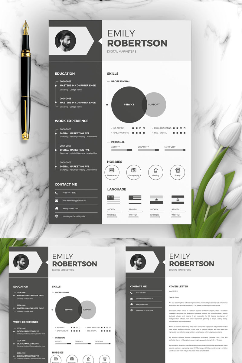 Download Резюме "Emily Resume Template" / Emily Resume Template - Резюме на тему графика 1 page resume 2 clean cv cover letter design template illustrator eps mac pages microsoft word modern photoshop psd professional