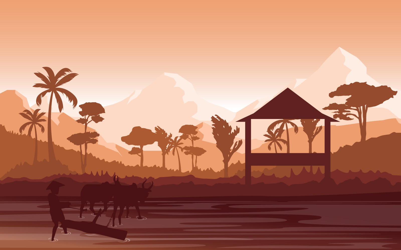 Download Иллюстрация "Farmer Cultivating Rice - Illustration" / Farmer Cultivating Rice - Illustration - Иллюстрация на тему графика asian,farmer,cultivating,rice,field,paddy,plantation,agriculture,illustration,vector,village,landscape,farm,road,background,hills,path,asia,dirt,garden