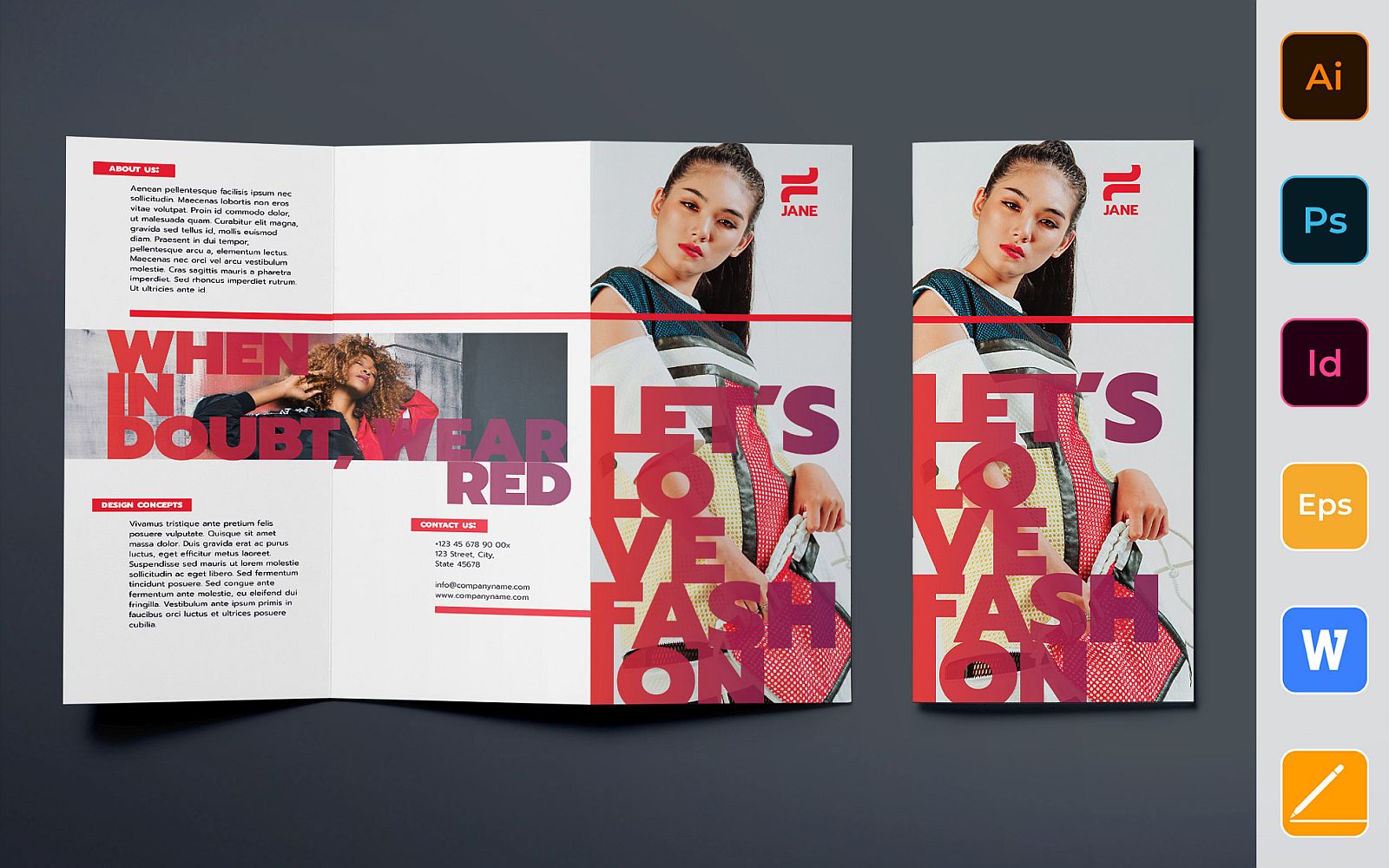 Download Фирменный стиль "Fashion Designer Brochure Trifold - Corporate Identity Template" / Fashion Designer Brochure Trifold - Corporate Identity Template - Фирменный стиль на тему графика brochure,trifold,template,corporate,company,branding,fashion,designer,style,model,fashionweek,clothes,gray,red,black