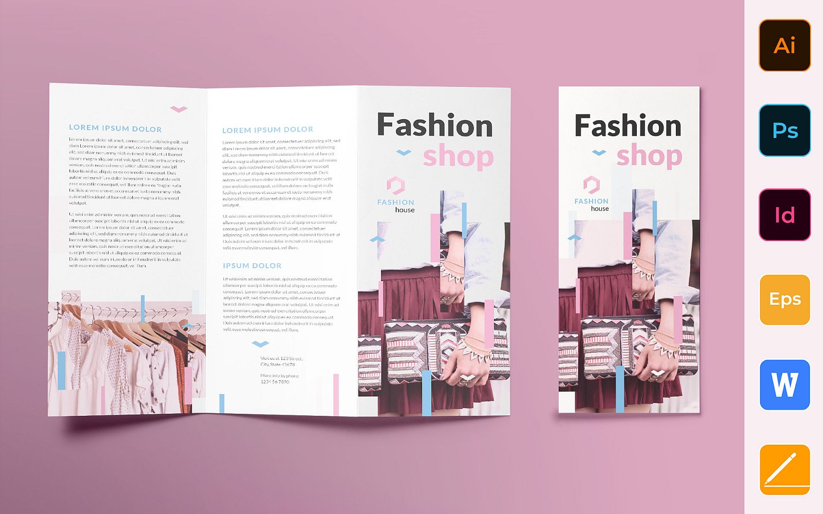 Download Фирменный стиль "Fashion House Brochure Trifold - Corporate Identity Template" / Fashion House Brochure Trifold - Corporate Identity Template - Фирменный стиль на тему графика brochure,trifold,template,corporate,company,branding,fashion,shop,store,clothes,shoes,accessories,white,blue,pink