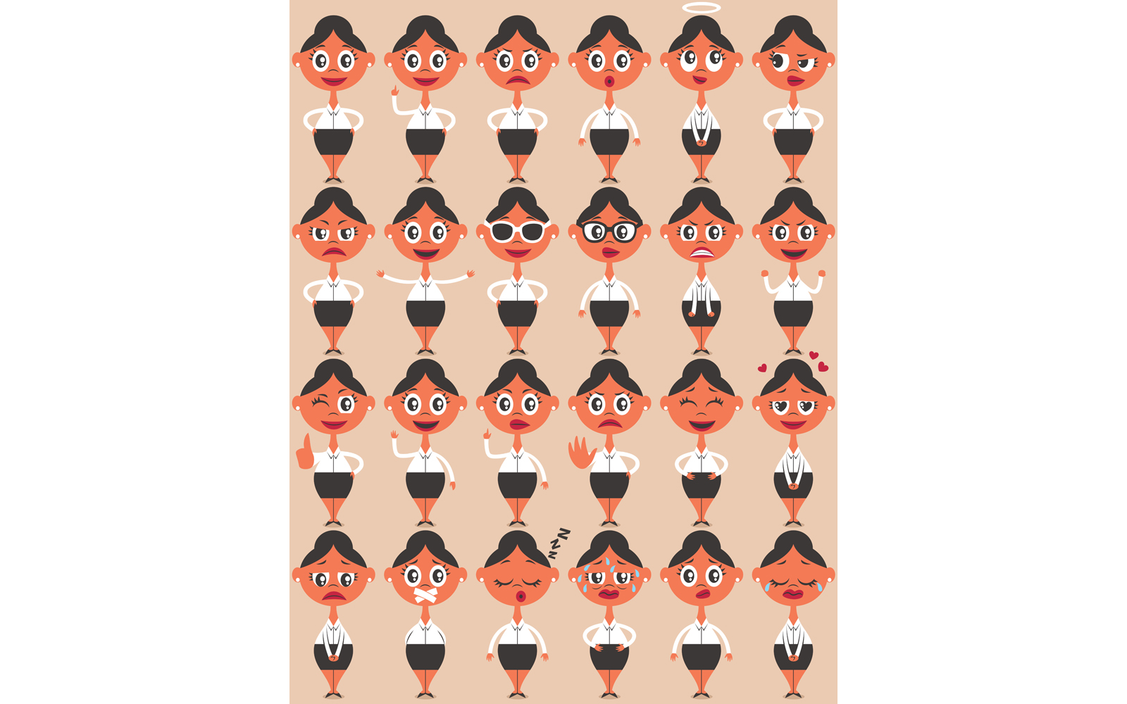 Download Иллюстрация "Female Character Emotions - Illustration" / Female Character Emotions - Illustration - Иллюстрация на тему графика businesswoman,manager,woman,people,character,cartoon,retro,vintage,emotion,pose,situation,emoticon,smile,mood,set