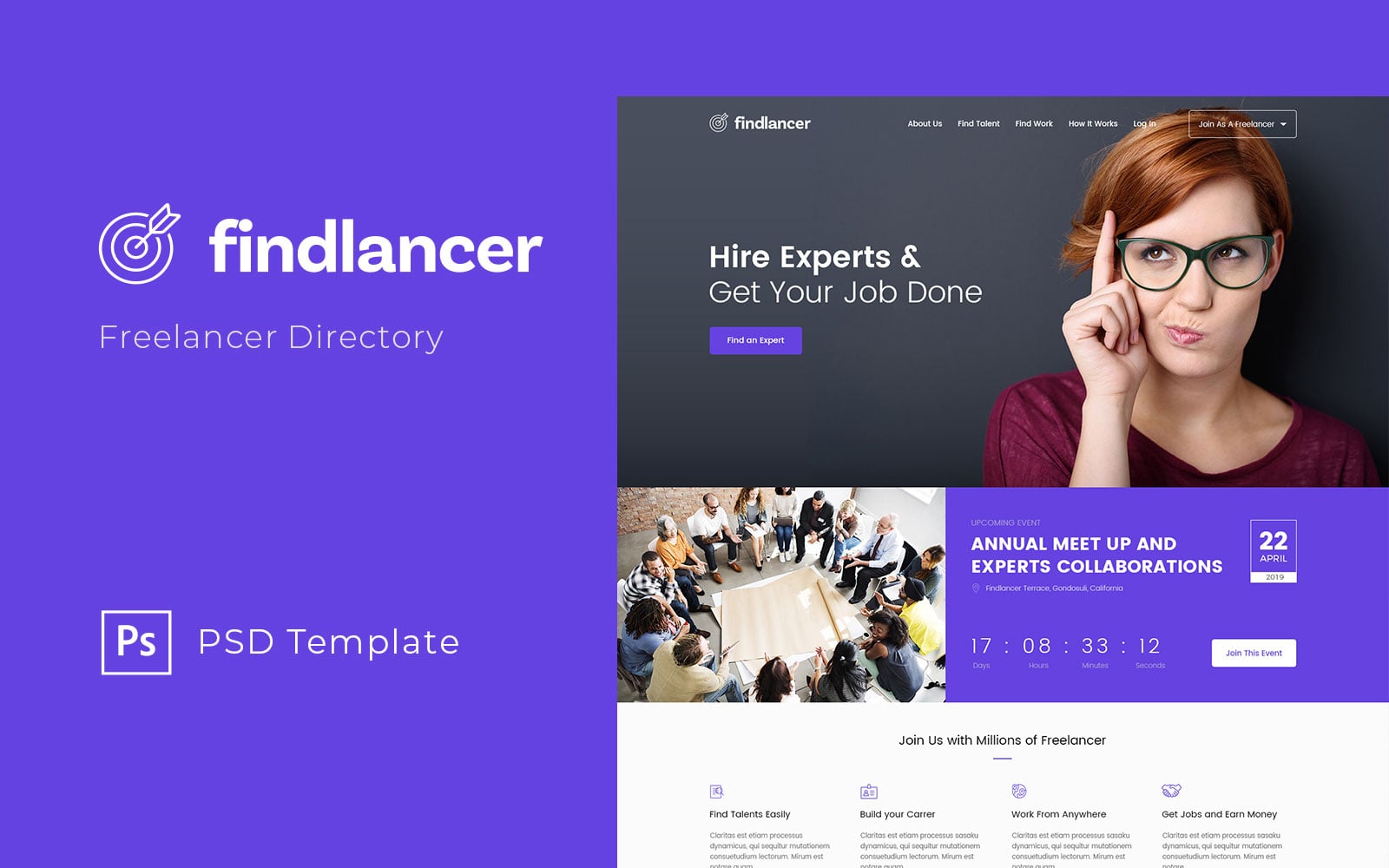 Download PSD шаблон "Findlancer - Freelancer Directory PSD Template" / Findlancer - Freelancer Directory PSD Template - PSD шаблон на тему графика freelance,freelancer,job,apply,project,website,jobs,hiring,remote,psd,template,customize,directory,modern,blog,landing