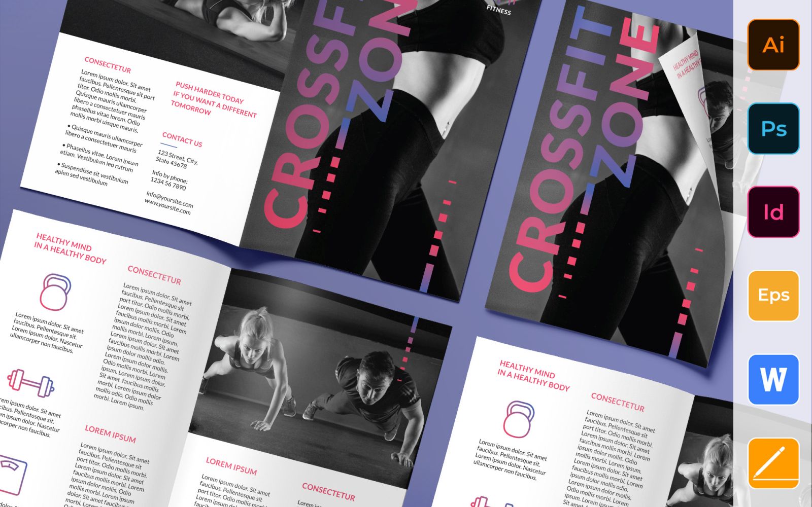 Download Фирменный стиль "Fitness Studio Brochure Bifold - Corporate Identity Template" / Fitness Studio Brochure Bifold - Corporate Identity Template - Фирменный стиль на тему графика brochure,bifold,template,corporate,company,branding,fitness,gym,training,sport,workout,trainer,blue,red,violet