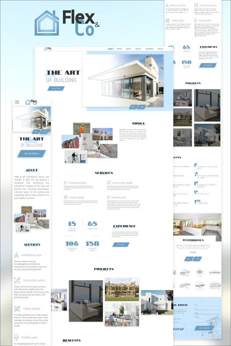 Download PSD шаблон "Flex & Co - Architectural and Construction Agency PSD Template" / Flex & Co - Architectural and Construction Agency PSD Template - PSD шаблон на тему графика architecture interior design construction apartment renovation and houses business work services benefits landing page template