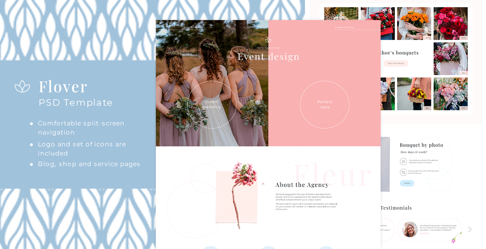 Download PSD шаблон "Flover - Flower Shop and Event Design PSD PSD Template" / Flover - Flower Shop and Event Design PSD PSD Template - PSD шаблон на тему цветочный магазин flower,anniversary,banquet,birthday,corporates,order,bouquet,buy,flowers,blog,florist,shop,delivery,event,cart,store,gentle,pink,blue,floral