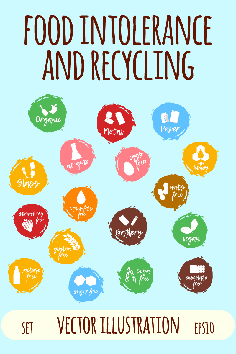 Download Набор иконок "Food Intolerance and Recycling Labels Icon Set" / Food Intolerance and Recycling Labels Icon Set - Набор иконок на тему веб-дизайн vector art cartoon label free gluten gmo icon intolerance vegan vitamin healthcare brush food organic honey lifestyle product eco badges