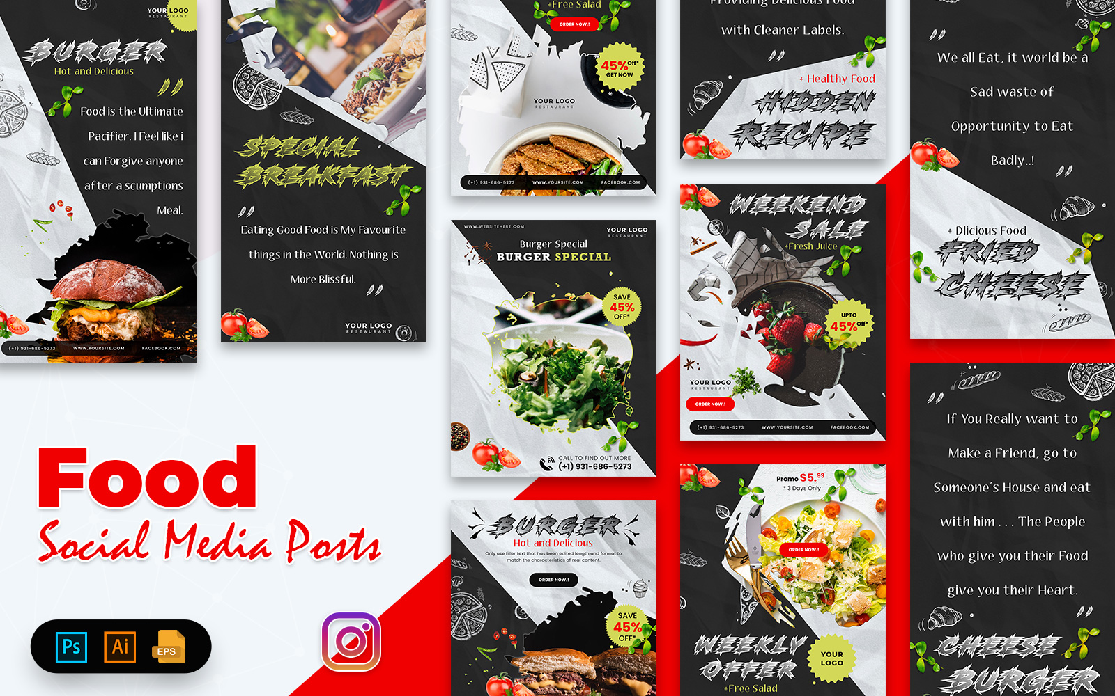 Download Шаблон для соцсетей "Food Posts Social Media Template" / Food Posts Social Media Template - Шаблон для соцсетей на тему графика social,media,banners,instagram,posts,stories,socialmedia,feed,story,banner,insta,food,festival,offer,promotion