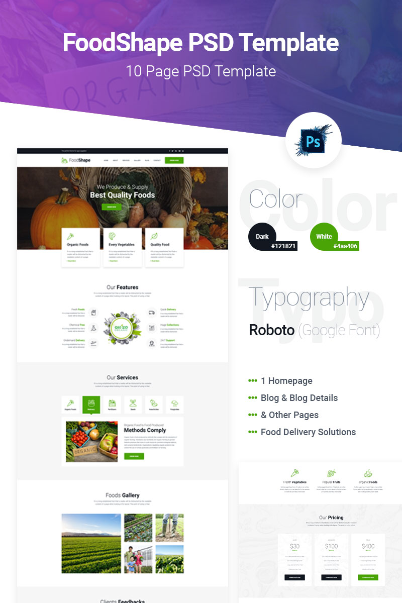 Download PSD шаблон "Foodshape Vegetable Delivery Service Company PSD Template" / Foodshape Vegetable Delivery Service Company PSD Template - PSD шаблон на тему напитки и еда food delivery foodhub psd template ui ux creative vegetable grocery shop selling