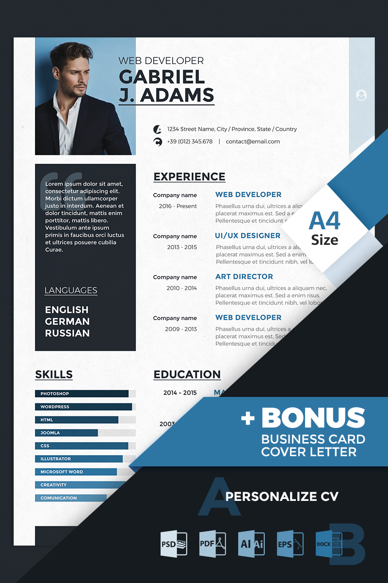Download Резюме "Пример резюме программиста" / Gabriel J Adams - Web Developer Resume Template - Резюме на тему графика cv resume business-card web prontable professional developer a4 cmyk vector customizable