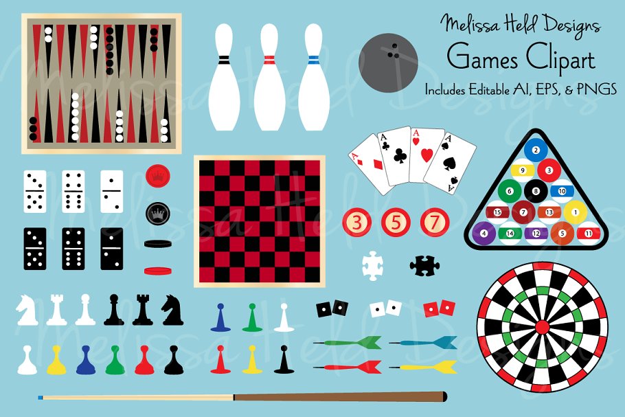Download Иллюстрация "Games Vector Clipart - Illustration" / Games Vector Clipart - Illustration - Иллюстрация на тему графика games,backgammon,chess,checkers,bowling,billiards,pool,dice,dartboard,dominoes,game pieces,playing cards,clipart,vector,graphic,printable,illustration,print,art,paper
