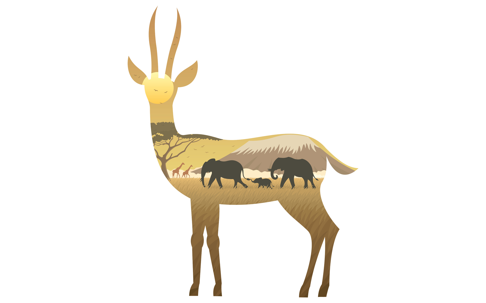 Download Иллюстрация "Gazelle Landscape - Illustration" / Gazelle Landscape - Illustration - Иллюстрация на тему графика africa,african,landscape,gazelle,impala,antelope,background,banner,double exposure,silhouette,elephant,giraffe,family,savannah,tree,acacia,grass,landmark,animal,safari