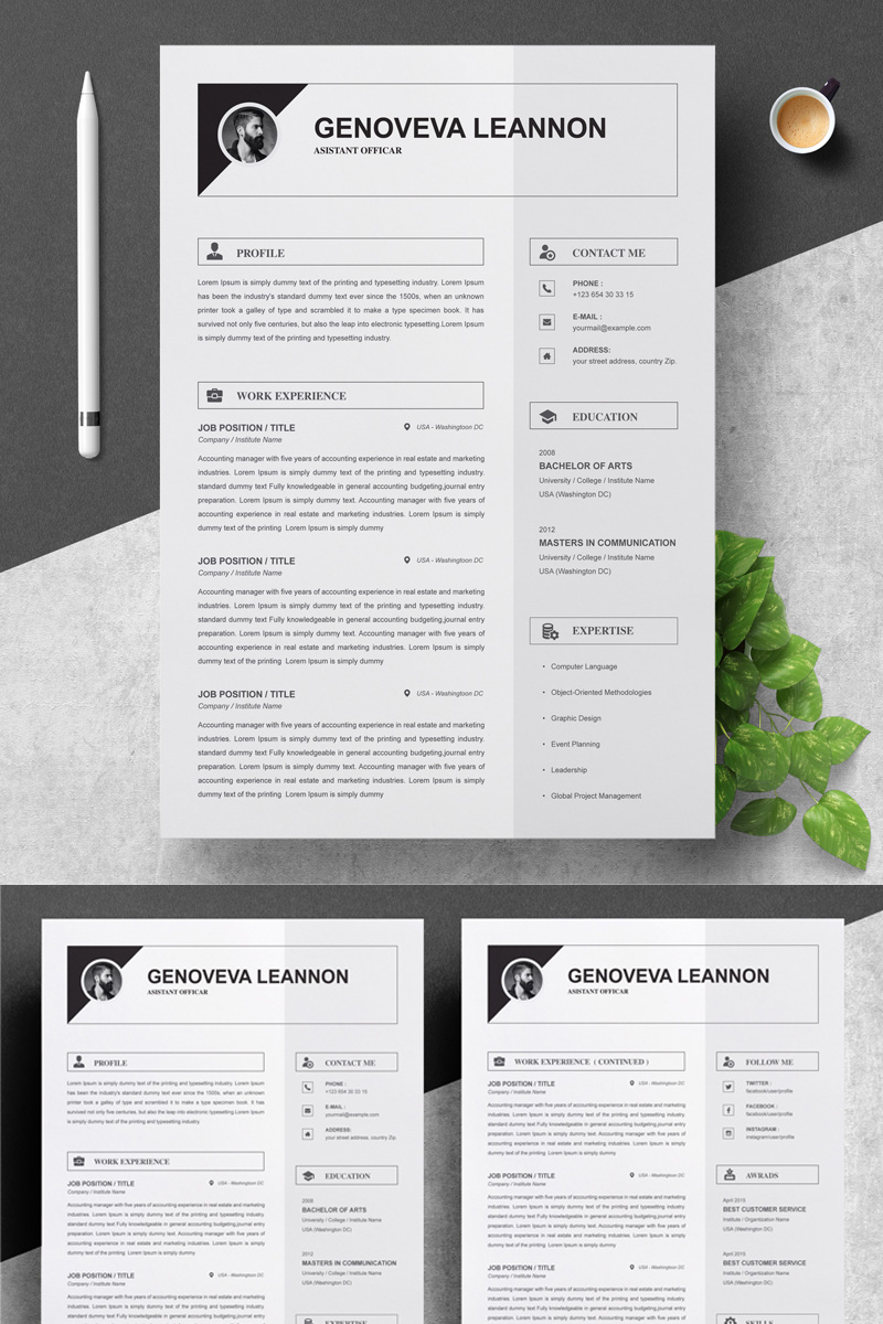 Download Резюме "Genoveva Resume Template" / Genoveva Resume Template - Резюме на тему графика 1 page resume 2 clean cv cover letter design template illustrator eps mac pages microsoft word modern photoshop psd professional