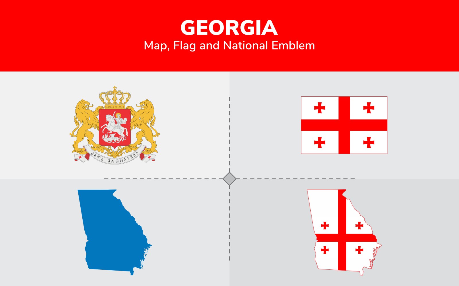 Download Иллюстрация "Georgia Map, Flag and National Emblem - Illustration" / Georgia Map, Flag and National Emblem - Illustration - Иллюстрация на тему графика continents,countries,map,political map,traveling,vector,emblem,national,flag,coat,arms,country,symbol,nations,state,sign,nation,badge,symbolic object,europe