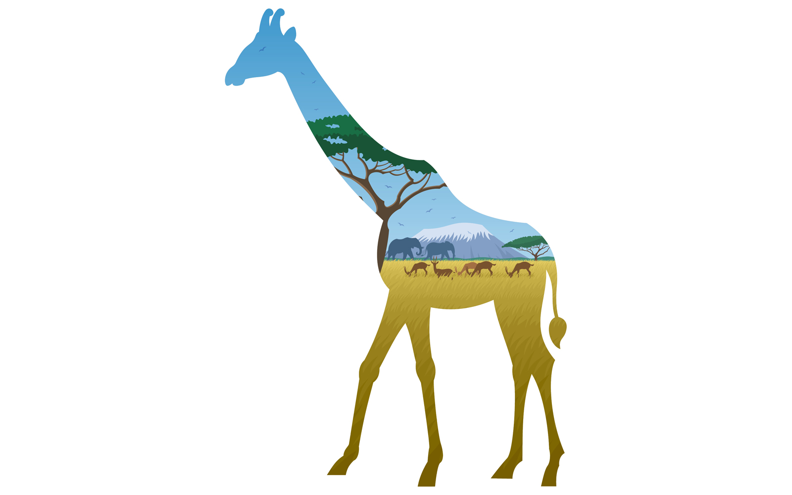 Download Иллюстрация "Giraffe Landscape - Illustration" / Giraffe Landscape - Illustration - Иллюстрация на тему графика africa,african,landscape,giraffe,background,banner,double exposure,silhouette,elephant,gazelle,impala,antelope,herd,savannah,tree,acacia,grass,landmark,animal,safari