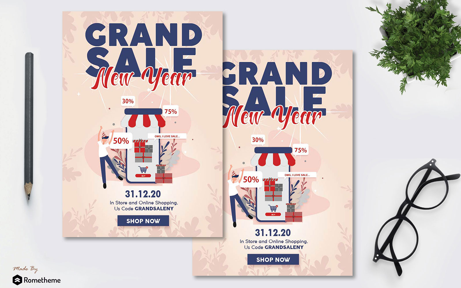 Download Фирменный стиль "Grand Sale New Years - Flyer AS - Corporate Identity Template" / Grand Sale New Years - Flyer AS - Corporate Identity Template - Фирменный стиль на тему графика grand,sale,new,years,flyer,business,promotion,invitation,sales,discount,apparel,product,brochure,banner
