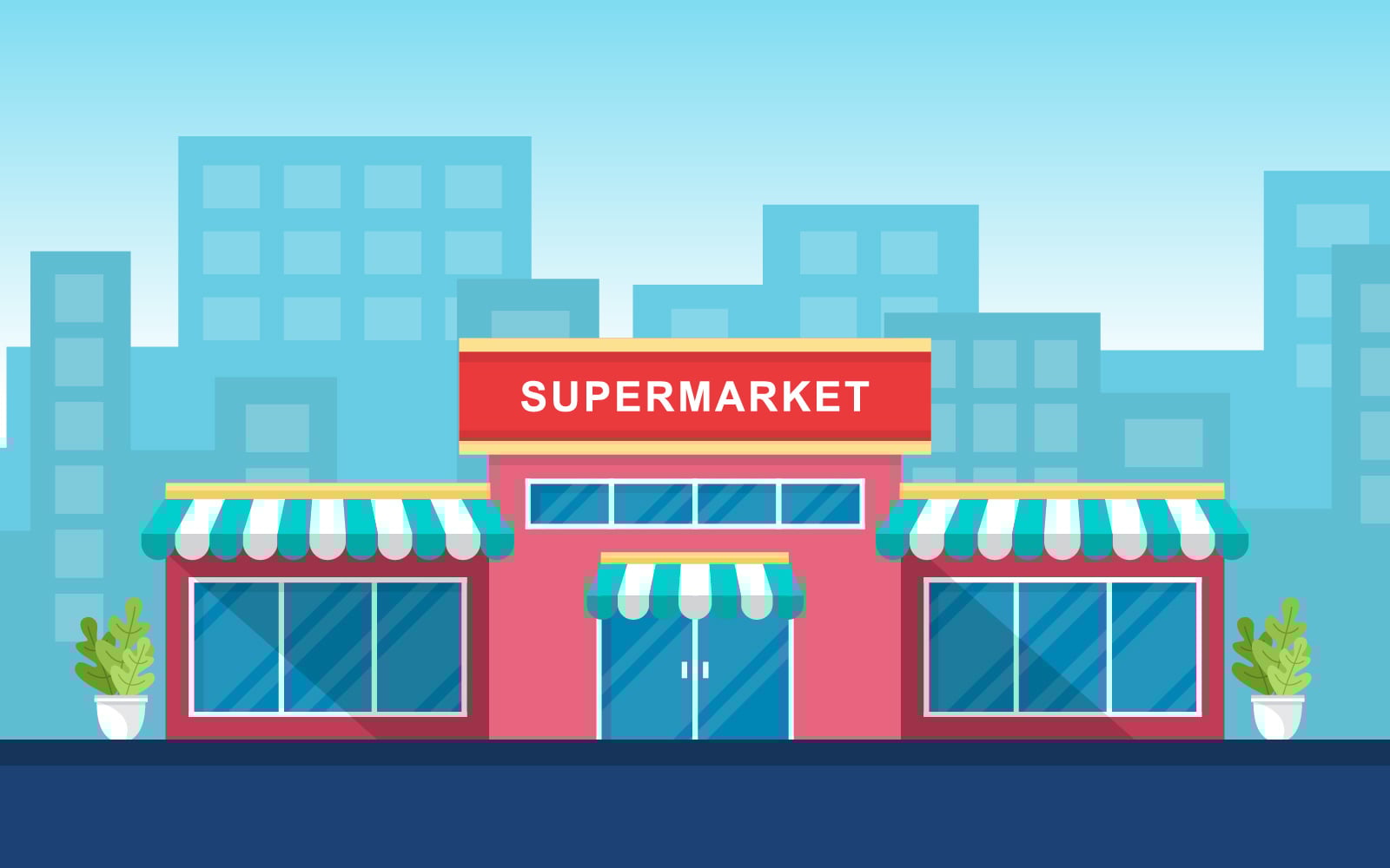 Download Иллюстрация "Grocery Retail Exterior - Illustration" / Grocery Retail Exterior - Illustration - Иллюстрация на тему графика supermarket,grocery,store,retail,shop,mall,city,building,flat,illustration,vector,template,background,day,clouds,cityscape,tree,car,front,design