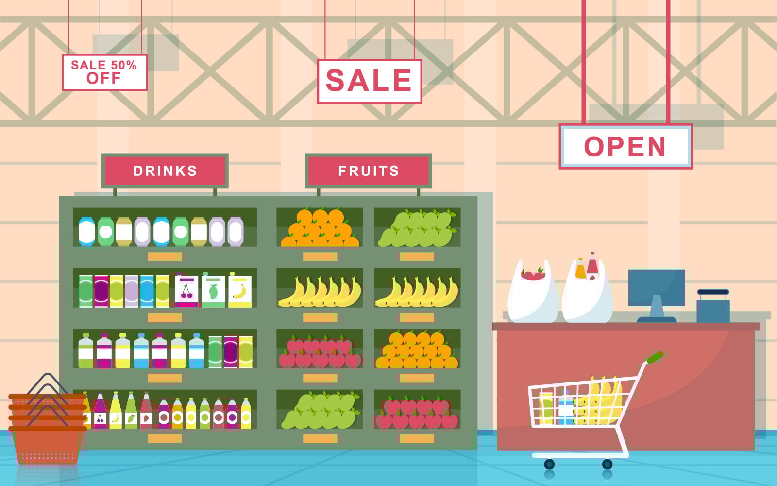 Download Иллюстрация "Grocery Retail Shop - Illustration" / Grocery Retail Shop - Illustration - Иллюстрация на тему графика supermarket,grocery,shelf,store,retail,shop,mall,interior,flat,illustration,vector,market,sale,fruit,milk,background,big,empty,groceries,showcase
