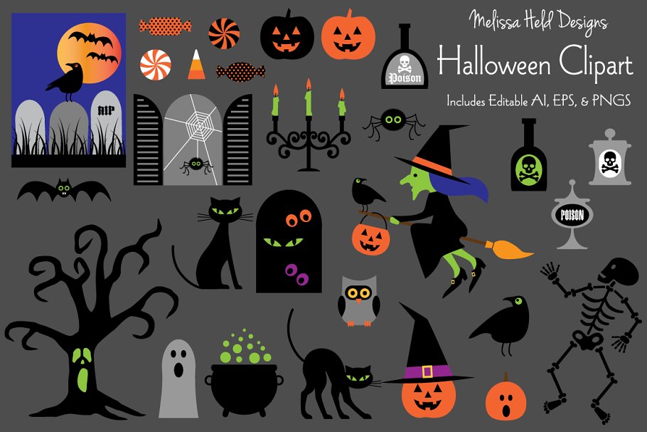 Download Иллюстрация "Halloween Clipart Vector - Illustration" / Halloween Clipart Vector - Illustration - Иллюстрация на тему графика candelabra,halloween,spider,tombstone,bat,ghost,skeleton,owl,cobweb,graveyard,pumpkin,candy corn,witch broom,jack o lantern,black cat,clipart,vector,graphic,potion,bubbling cauldron