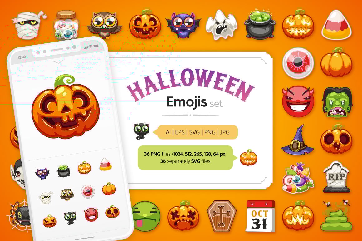 Download Набор иконок "Halloween Emojis Set Icon" / Halloween Emojis Set Icon - Набор иконок на тему social media halloween,emoji,set,face,icon,symbol,chat,cartoon,emoticon,ghost,funny,character,cat,pumpkin,candy,monster,cute,spooky,zombie,bat