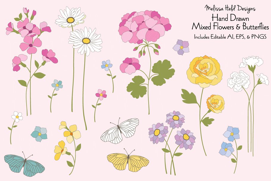 Download Иллюстрация "Hand Drawn Flowers & Butterflies - Illustration" / Hand Drawn Flowers & Butterflies - Illustration - Иллюстрация на тему графика clipart,vector,graphic,printable,illustration,print,art,paper,hand drawn,design,flower,flowers,floral,botanical,pattern,butterfly,butterflies,nature,rose,daisy