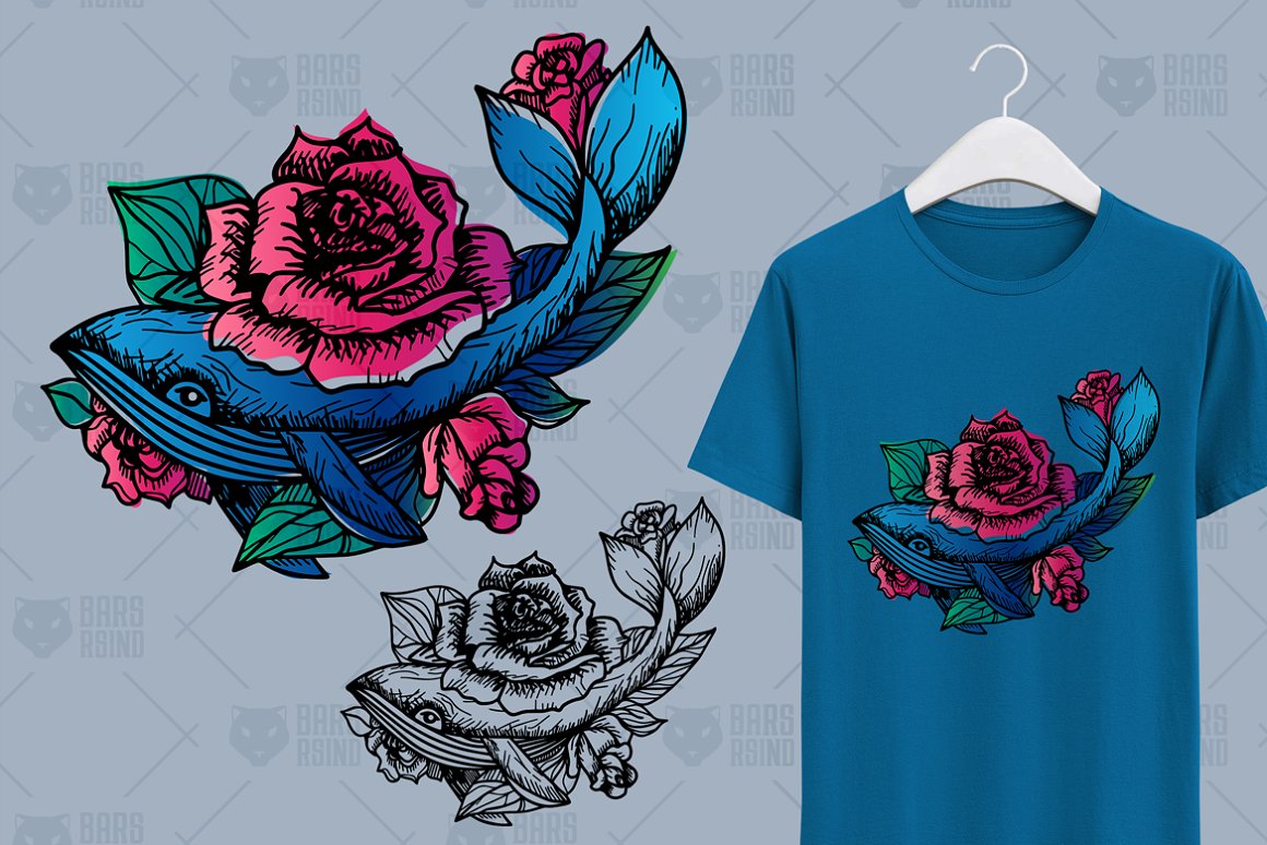Download Иллюстрация "Hand Drawn Whale In Roses - Illustration" / Hand Drawn Whale In Roses - Illustration - Иллюстрация на тему графика vector,illustration,whale,rose,flower,bud,floral,flourish,burgeon,nature,natural,abstract,petal,leaf,leafage,sea,ocean,marine,mammal,blossom