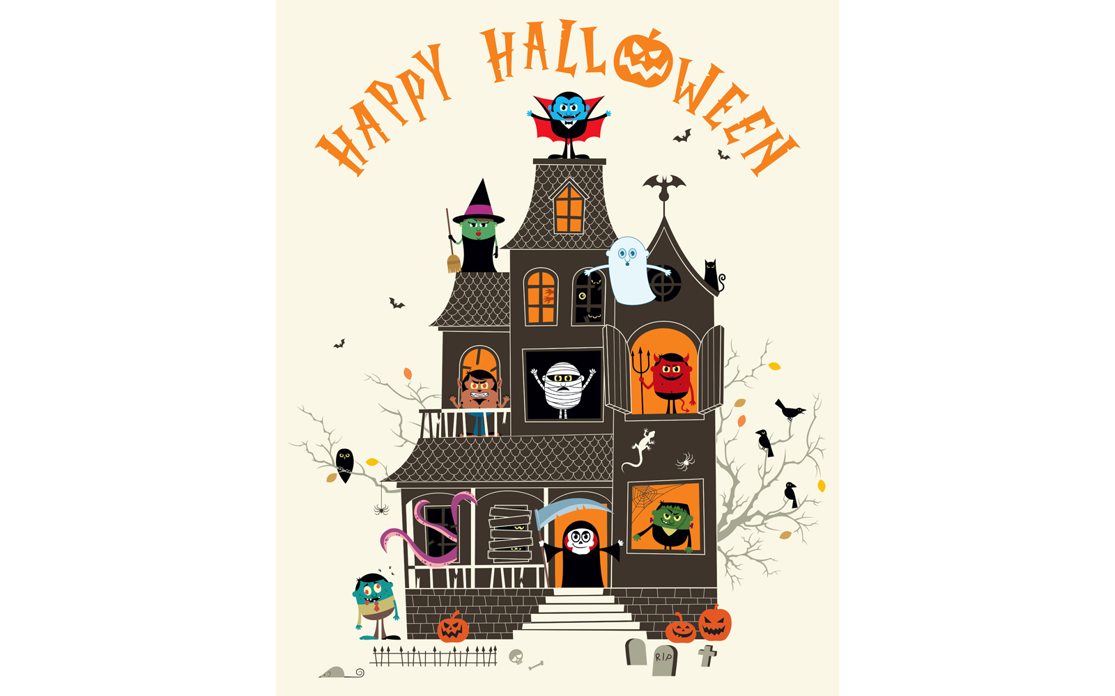 Download Иллюстрация "Haunted House - Illustration" / Haunted House - Illustration - Иллюстрация на тему графика halloween,haunted,house,mansion,character,cartoon,monster,beast,creature,vampire,count,dracula,mummy,frankenstein,werewolf,devil,ghost,reaper,grim