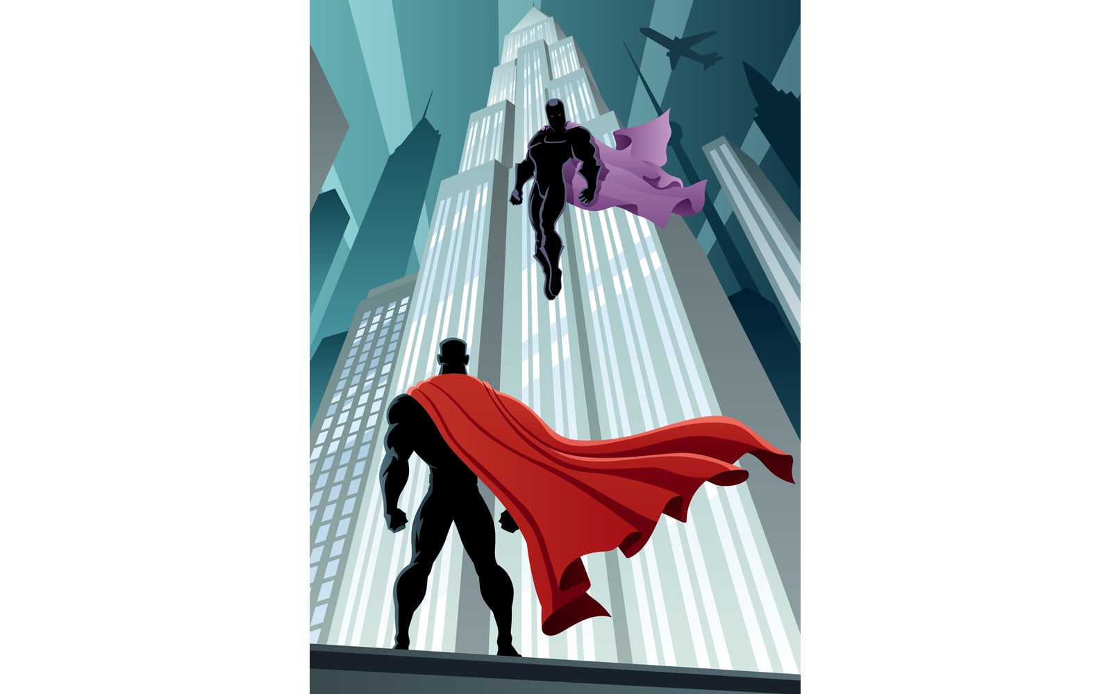 Download Иллюстрация "Hero Versus Villain - Illustration" / Hero Versus Villain - Illustration - Иллюстрация на тему графика superhero,super,hero,man,superman,supervillain,villain,silhouette,evil,good,battle,facing,confrontation,versus,vs,concept,justice,savior,defender,protector