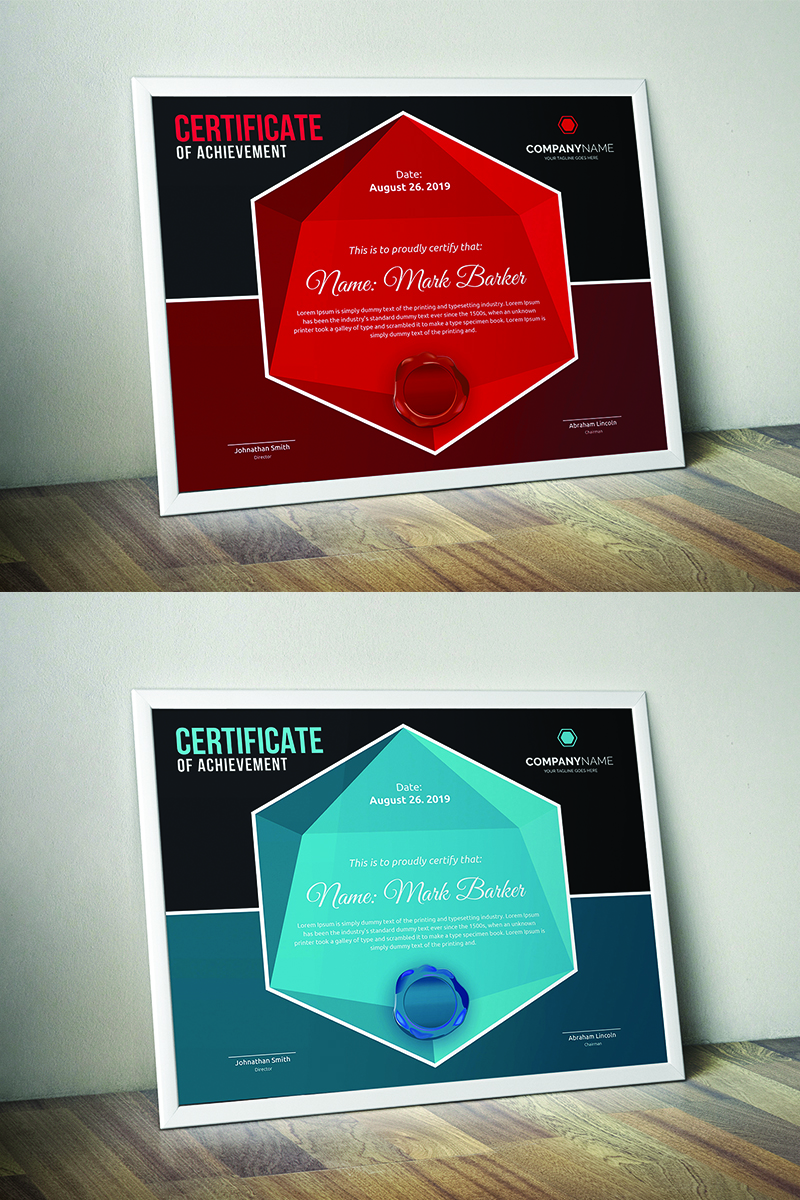 Download Шаблон сертификата "Hexagonal Modern Certificate Template" / Hexagonal Modern Certificate Template - Шаблон сертификата на тему графика certificate corporate decorative diploma elegant excellence frame graduation green modern multicolor ornament ornaments paper print ready template professional red simple