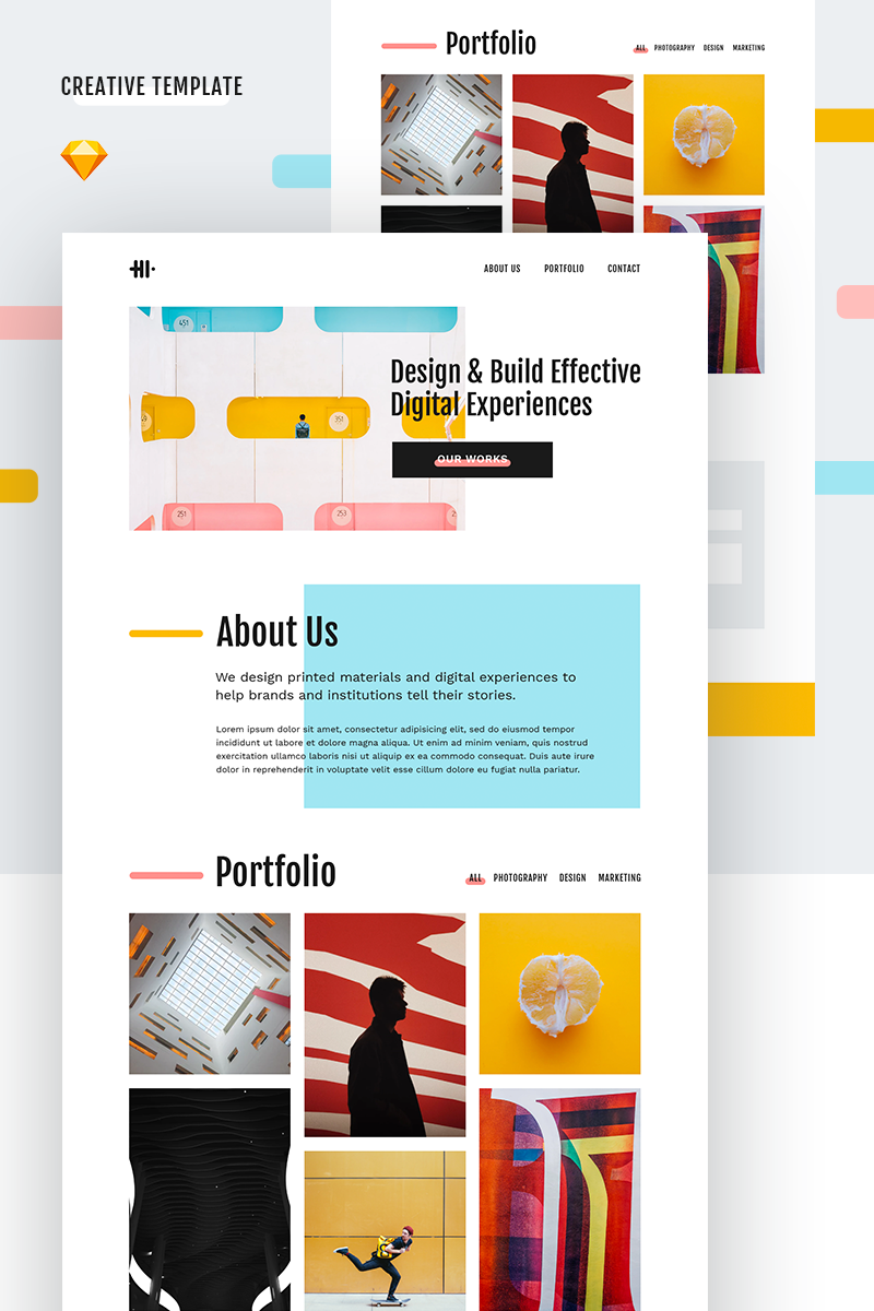 Download Sketch шаблон "Hi Creative Sketch Template" / Hi Creative Sketch Template - Sketch шаблон на тему графика landing page creative modern trendy portfolio theme template onepage ux ui sketch studio agency