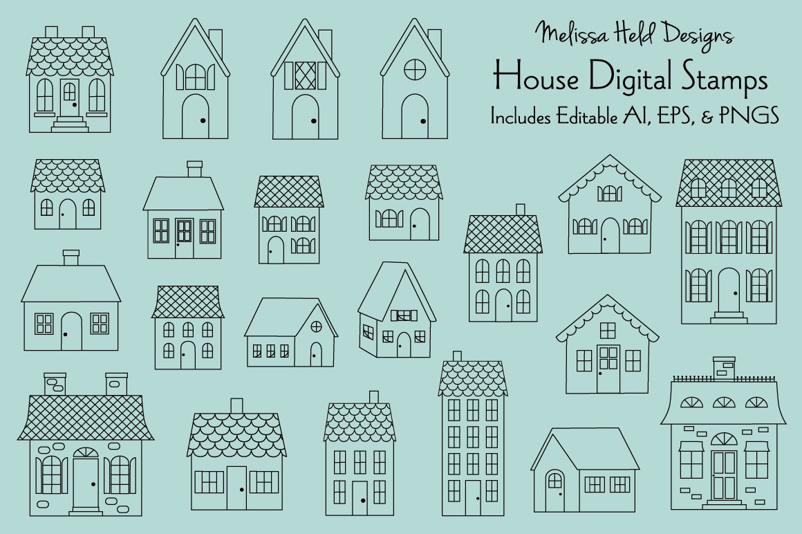 Download Иллюстрация "House Digital Stamps Vector - Illustration" / House Digital Stamps Vector - Illustration - Иллюстрация на тему графика apartment building,cabin,chalet,chimneys,doors,old fashioned,georgian,home,house,mansion,roof,town,village,outline,coloring book,printable,clipart,vector,graphic,illustration
