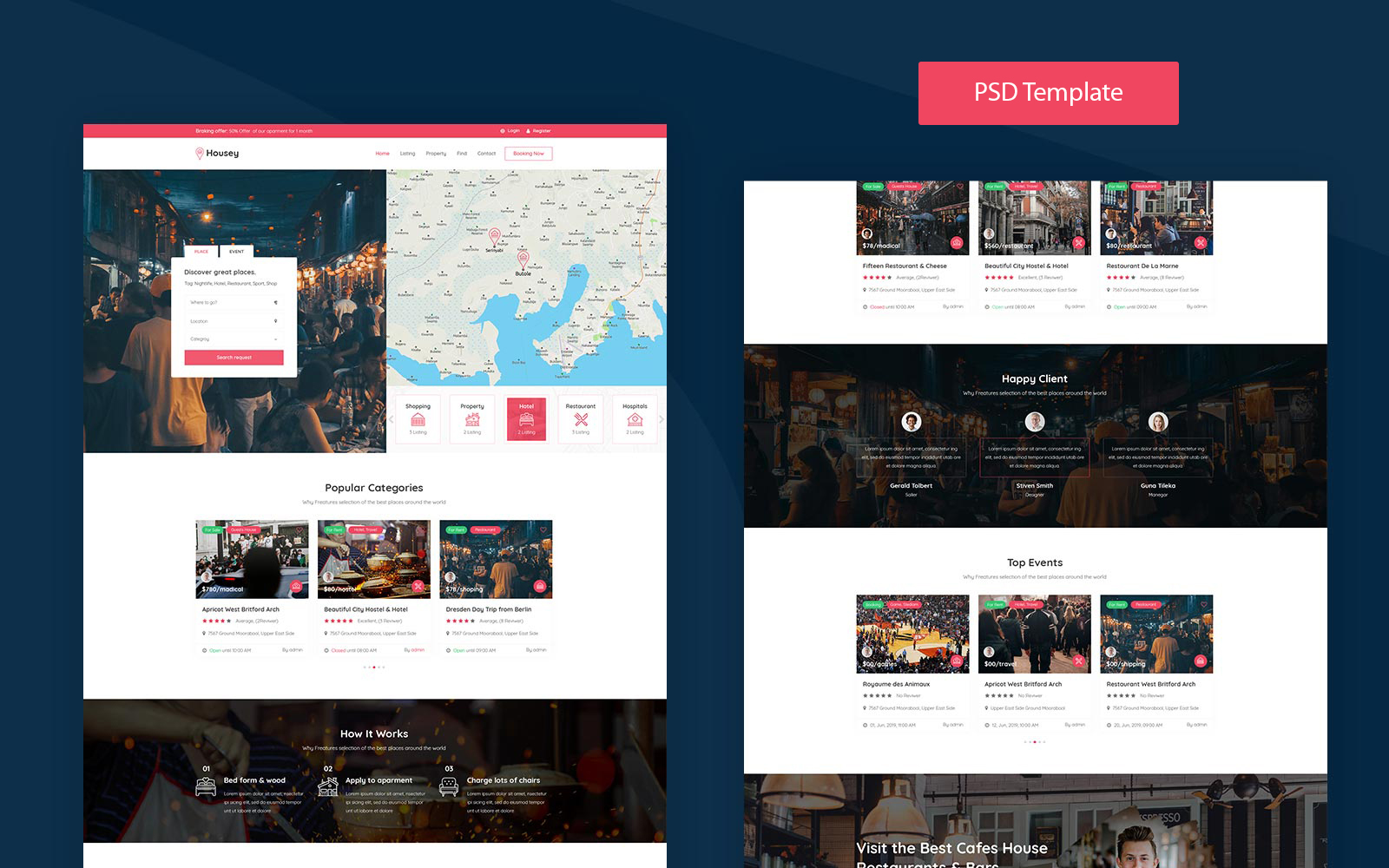 Download PSD шаблон "Housey - Listing Directory PSD Template" / Housey - Listing Directory PSD Template - PSD шаблон на тему бизнес и услуги airbnb,booking,companies,directory,listing,local,real,estate,reservationundefined