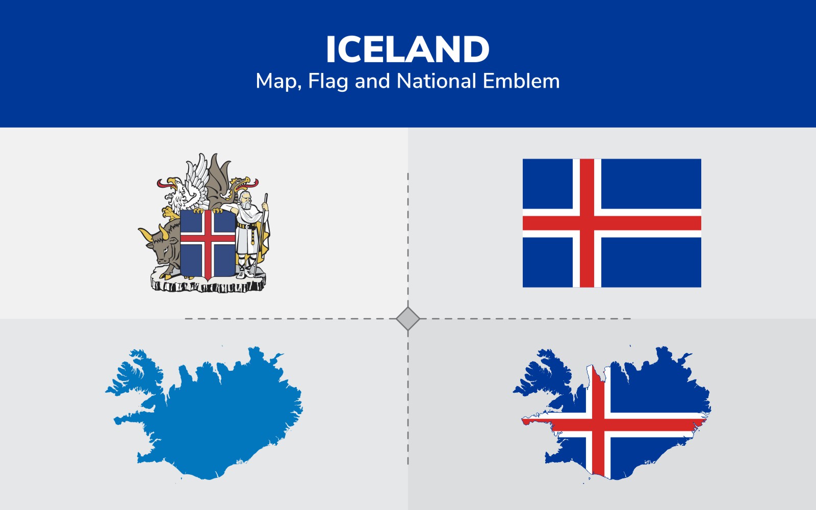 Download Иллюстрация "Iceland Map, Flag and National Emblem - Illustration" / Iceland Map, Flag and National Emblem - Illustration - Иллюстрация на тему графика continents,countries,map,political map,traveling,vector,emblem,national,flag,coat,arms,country,symbol,nations,state,sign,nation,badge,symbolic object,europe