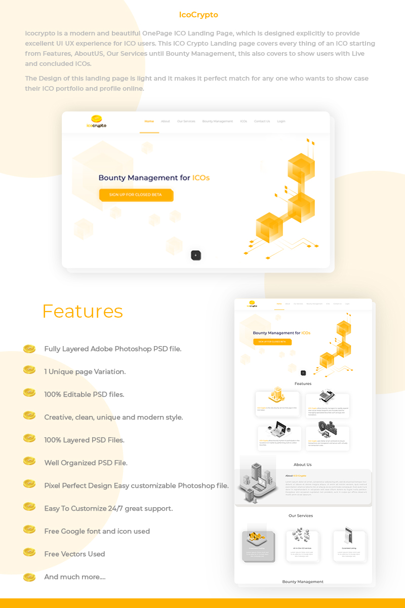 Download PSD шаблон "ICOCrypto PSD Template" / ICOCrypto PSD Template - PSD шаблон на тему консалтинг ico crypto cryptocurrencies blockchain marketing finance bitcoin exchange coin trading business agency