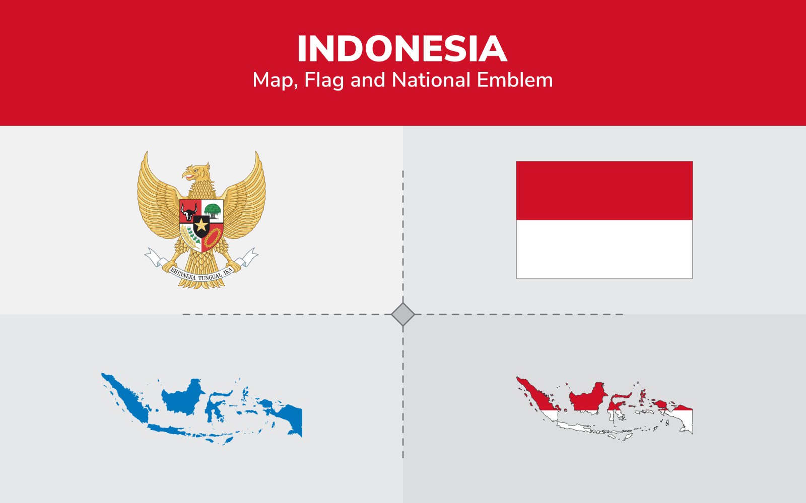 Download Иллюстрация "Indonesia Map, Flag and National Emblem - Illustration" / Indonesia Map, Flag and National Emblem - Illustration - Иллюстрация на тему графика continents,countries,map,political map,traveling,vector,emblem,national,flag,coat,arms,country,symbol,nations,state,sign,nation,badge,symbolic object,europe