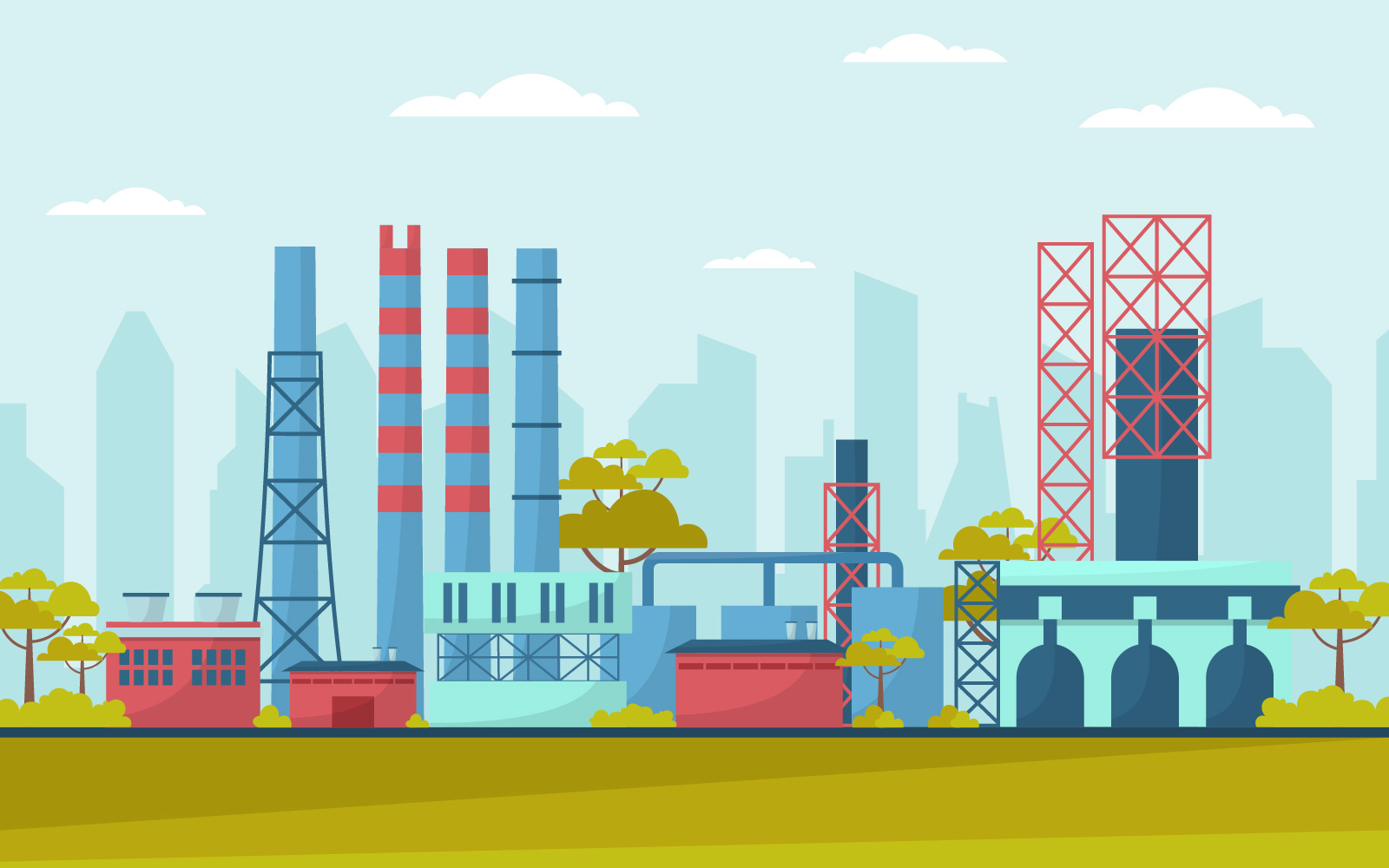 Download Иллюстрация "Industrial Factory Area - Illustration" / Industrial Factory Area - Illustration - Иллюстрация на тему графика industrial,factory,concept,manufacturing,building,facilities,area,flat,illustration,landscape,vector,business,engine,industry,manufacture,tree,cloud,sky,road,day
