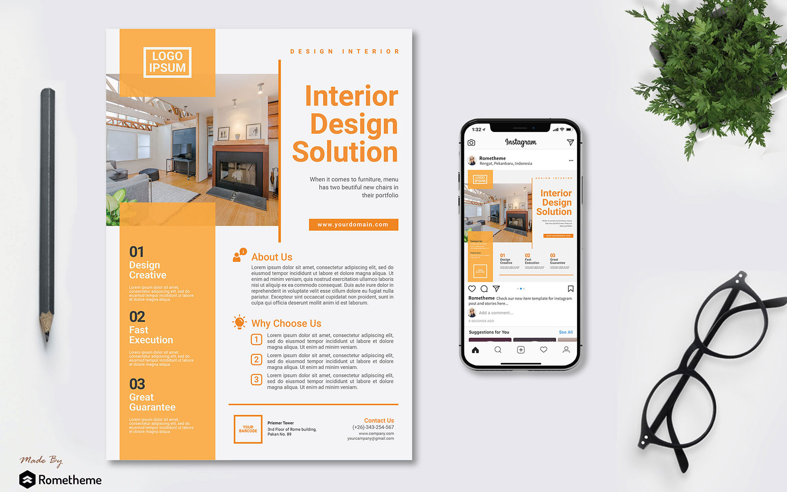 Download Фирменный стиль "Interior Design Solution - Flyer KF - Corporate Identity Template" / Interior Design Solution - Flyer KF - Corporate Identity Template - Фирменный стиль на тему графика interior,design,logo,ipsum,banner,brochure,home,creative,instagram,template,flyer,poster,orange,white,grey