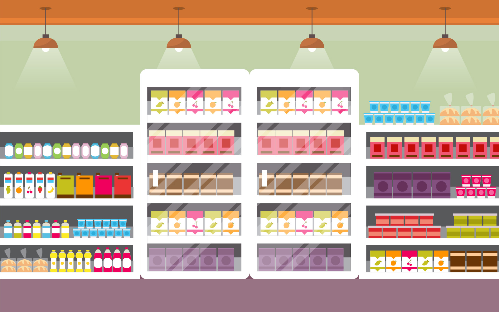 Download Иллюстрация "Interior Retail Shelf Store - Illustration" / Interior Retail Shelf Store - Illustration - Иллюстрация на тему графика supermarket,grocery,shelf,store,retail,shop,mall,interior,flat,illustration,vector,market,sale,fruit,milk,background,big,empty,groceries,showcase