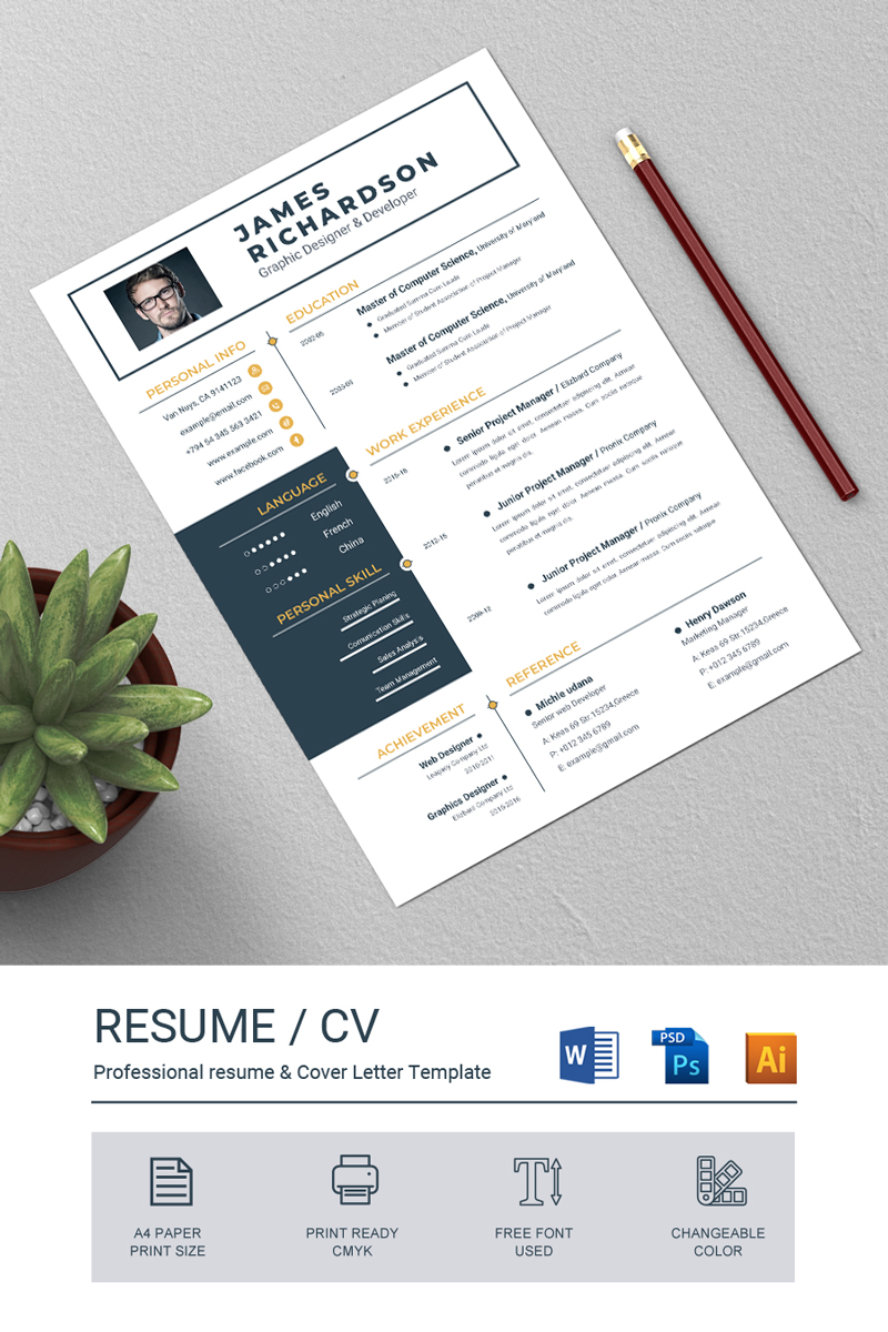 Download Резюме "James Resume Template" / James Resume Template - Адаптивный Резюме на тему графика a4 clean resume cv doc elegant template indesign infographic modern professional creative design minimal pages portfolio word us letter