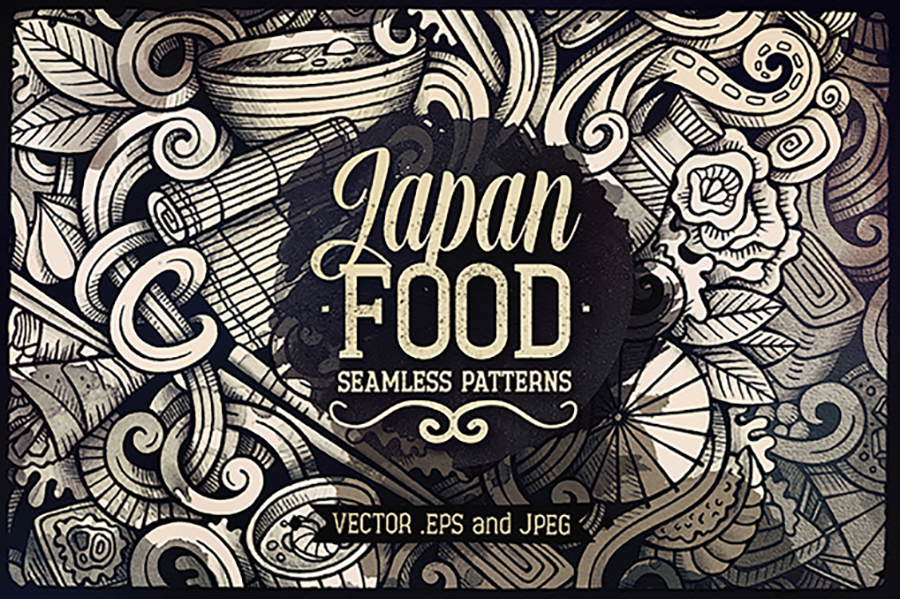Download Pattern "Japan Food Graphics Doodles Seamless Pattern" / Japan Food Graphics Doodles Seamless Pattern - Pattern на тему графика fun,vintage,hand-drawn,illustration,retro,food,cooking,doodles,decorative,vector,artistic,graphics,restaurant,bar,menu,background,product,graphic,kitchen,sketch,cartoon,asia,set,roll,asian,or