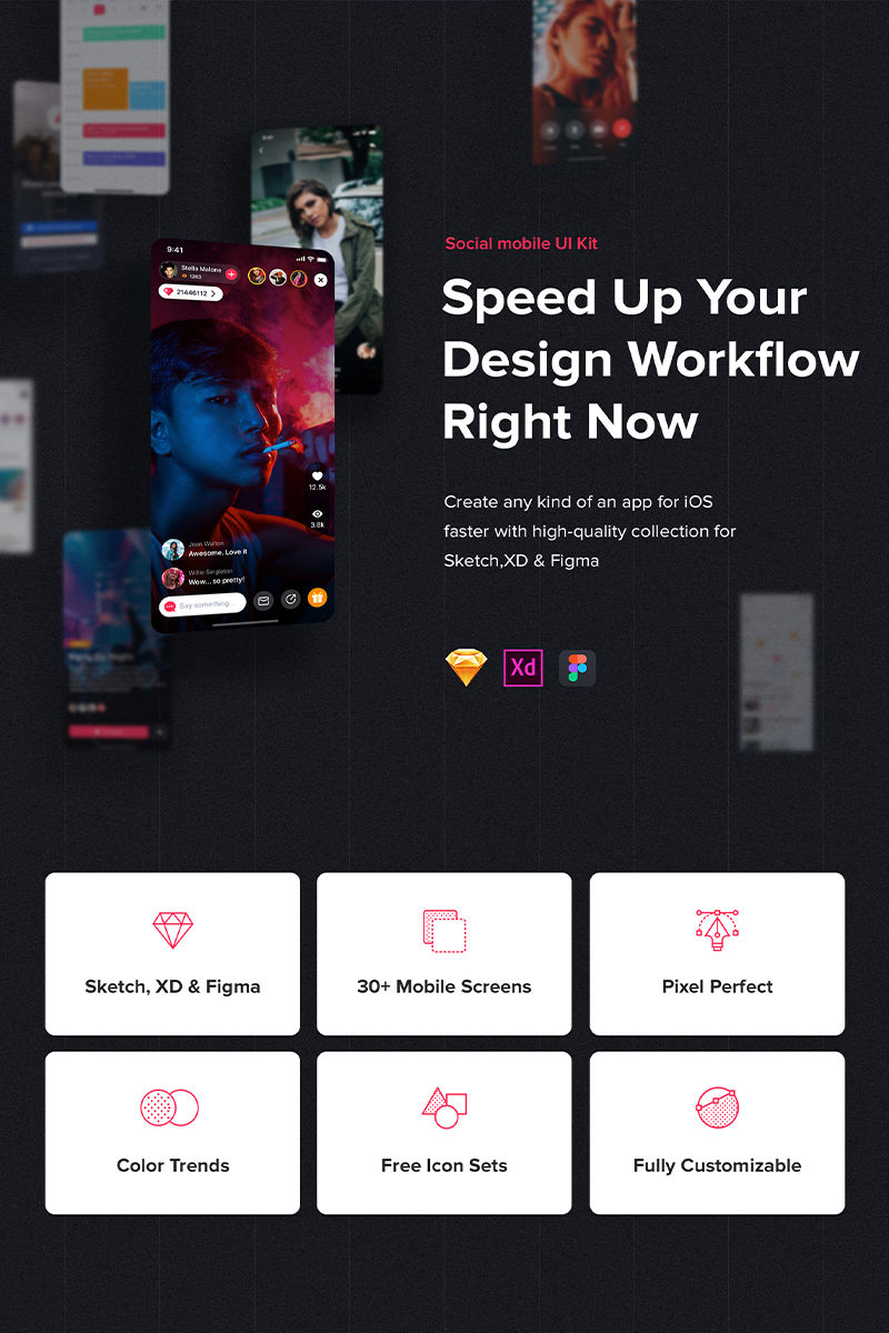 Download UI элементы "Jazam - Social mobile app UI Kit " / Jazam - Social mobile app UI Kit - UI элементы на тему графика social signup profile ui mobile kit dating message chat feed stream live app theme template ios iphone network podcast streamer