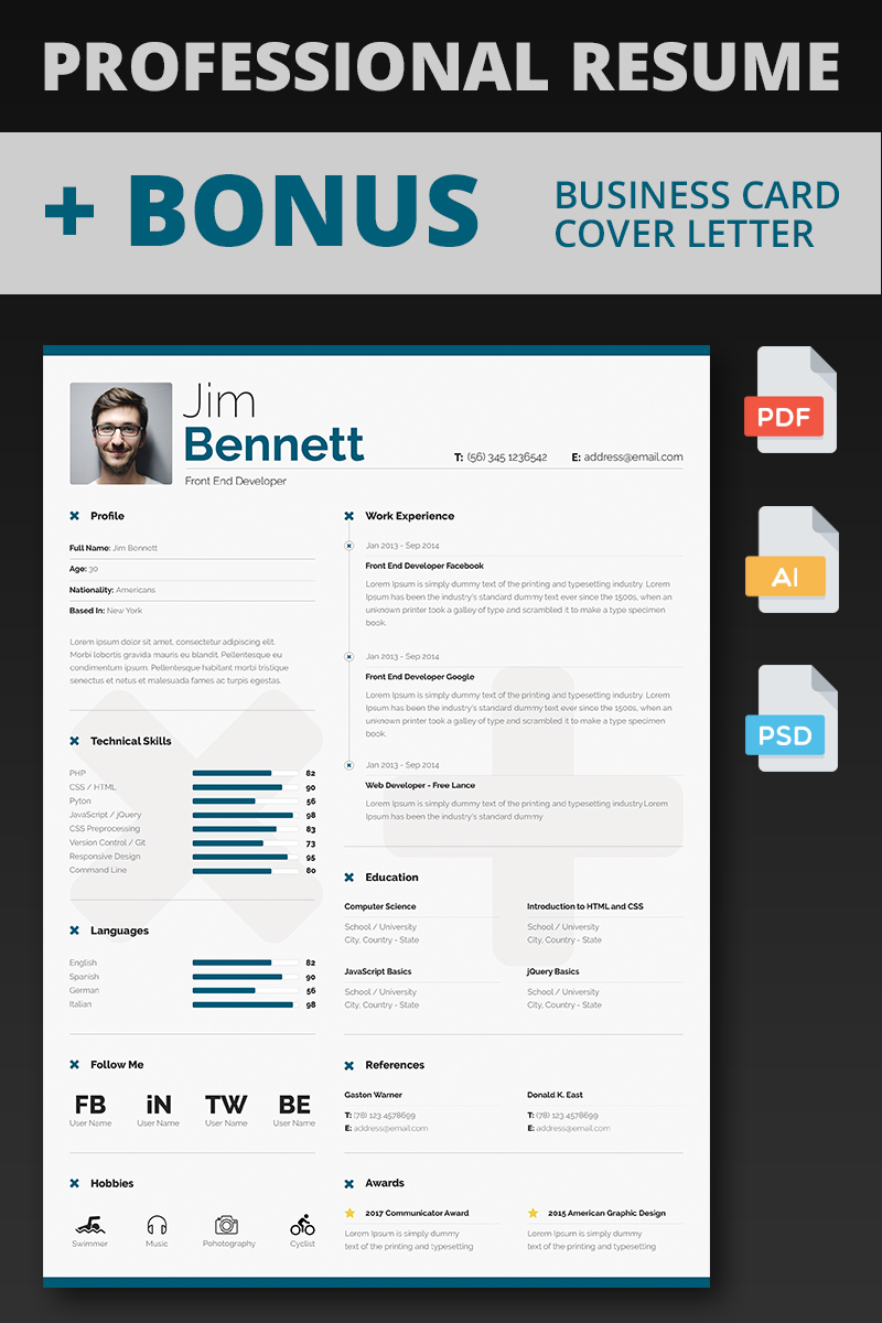 Download Резюме "Jim Bennett Front End Developer Resume Template" / Jim Bennett Front End Developer Resume Template - Резюме на тему графика resume cv printable business-card vector editable free-fonts psd ai bonus professional clean customizable a4 cmyk print-ready 300dpi cover letter pdf