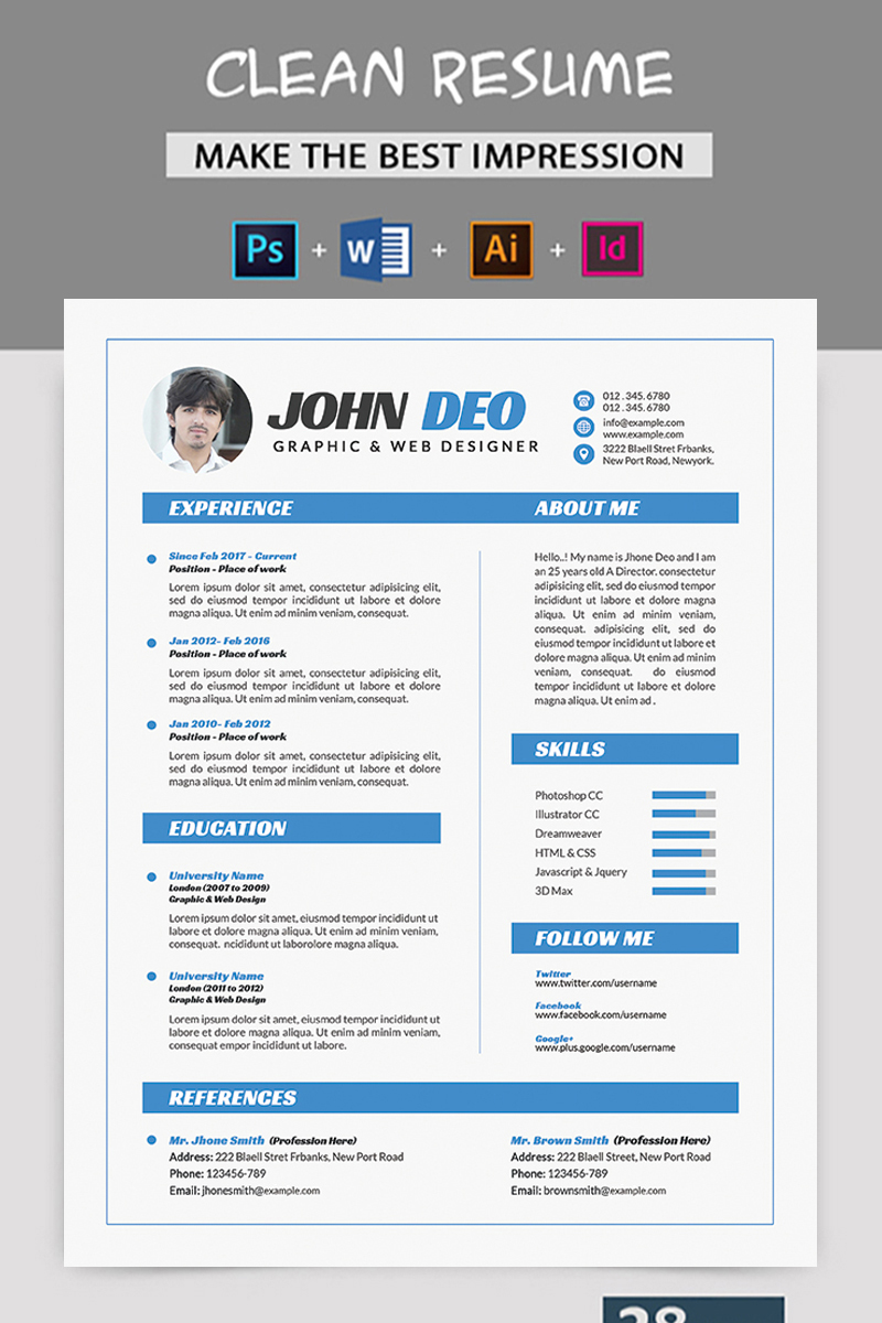 Download Резюме "John Deo - Resume Template" / John Deo - Resume Template - Резюме на тему графика clean resume cover letter creative curriculum vitae cv design template editable elegant job light professional red ai simple swiss white